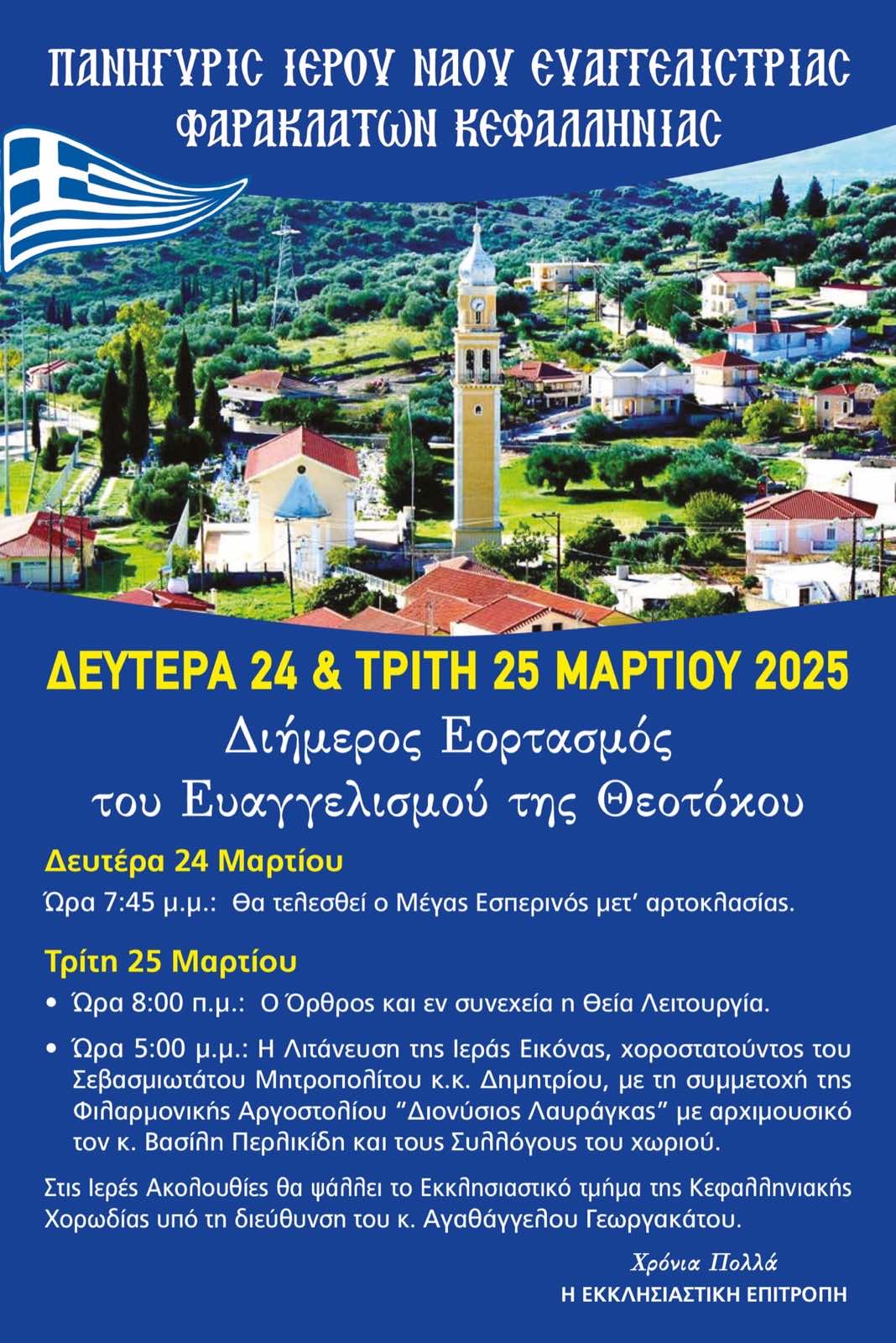 Το Εκκλησιαστικό Συμβούλιο του Ιερού Ναού Αγ. Δημητρίου-Ευαγγελίστριας Φαρακλάτων, σας προσκαλεί να τιμήσετε με την παρουσία σας την Ιερά Πανήγυρις του Ευαγγελισμού της Θεοτόκου στις 24 και 25 Μαρτίου 2025 στον Ιερό Ναό Ευαγγελίστριας Φαρακλάτων.