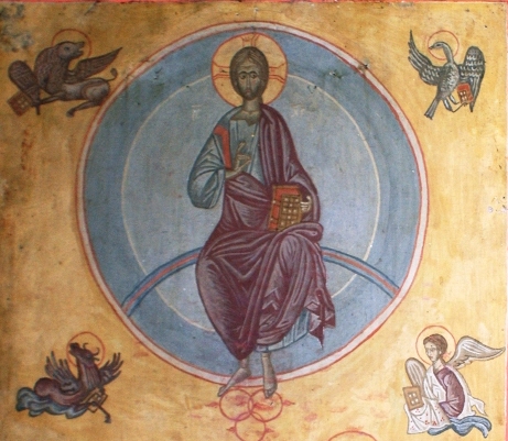 Στο πάνω μέρος της εικόνας εικονίζεται ο Αναστάντας Χριστός   μέσα σε  κυκλική δόξα, δείχνοντας έτσι το μεγαλείο και  την ολότητα του ουρανού,  καθήμενος επί ουρανίου τόξου,  κρατώντας   το ευαγγέλιο, ενώ με το άλλο χέρι ευλογεί. Στα πόδια του υπάρχουν τρία εξαπτέρυγα που τον ανεβάζουν προς τα επάνω. Στα τέσσερα σημεία εξωτερικά της κυκλικής δόξας εικονίζονται τα τέσσερα σύμβολα των Ευαγγελιστών που συμβολίζουν την ανθρώπινη και θεϊκή υπόσταση του Χριστού.  Ο αετός (του Ιωάννη), ο λέων (του Μάρκου), ο ταύρος (του Λουκά)  και ο άγγελος (του Ματθαίου) .