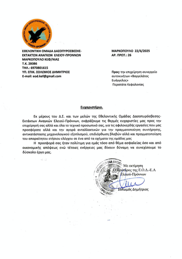 Η ΕΟΔ Ελειού-Πρόννων ευχαριστεί την επιχείρηση Ευαγγελάτος για την σπουδαία προσφορά