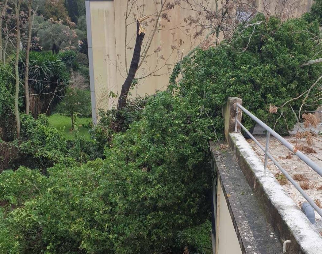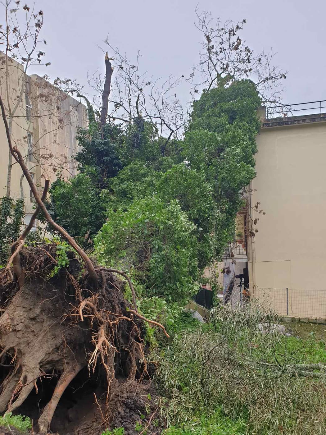 Σημαντικότερο όλων, η περίπτωση στο Κανόνι. Αφού, εκεί, ένα πολλών ετών δέντρο ξεριζώθηκε από το σφοδρό άνεμο και έπεσε πάνω σε μια πολυκατοικία στην οδό Ναυσικάς, με την πυροσβεστική να αναλαμβάνει δράση.