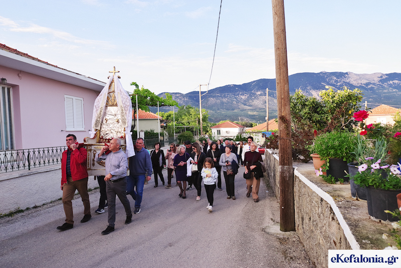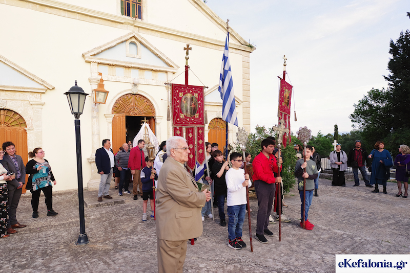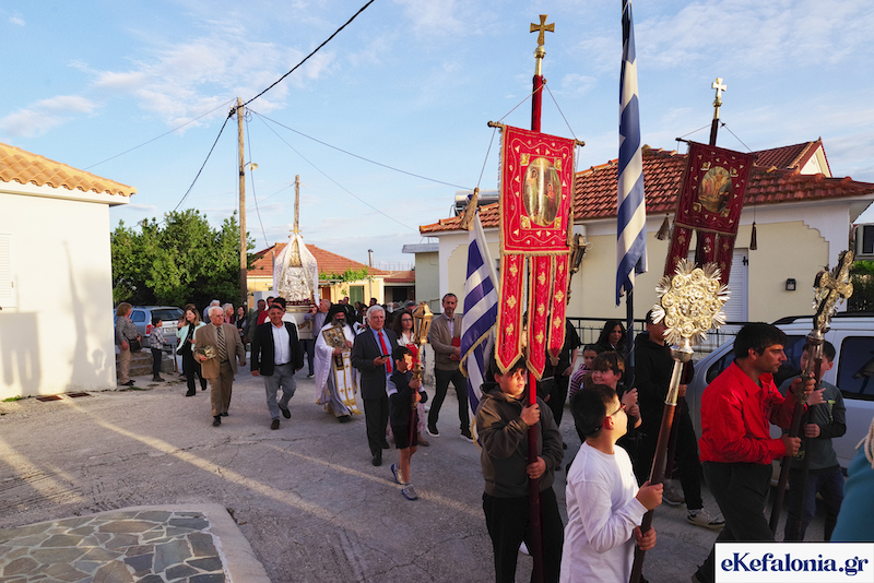 Λίγο μετά τις 19:00, παιδιά κρατώντας τα εξαπτέρυγα προπορεύτηκαν της πομπής, την οποία ακολουθούσε ο Αρχιμανδρίτης π. Μάρκος Αποστολάτος μαζί με την ιερή εικόνα. Η πομπή διέσχισε τους δρόμους του χωριού, σταματώντας στο μνημείο των πεσόντων, όπως επιτάσσει το έθιμο, πριν η πομπή επιστρέψει στον ναό.