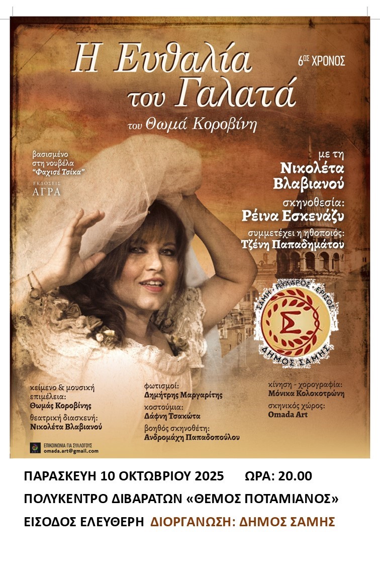 Ο Δήμος Σάμης σας ενημερώνει ότι την Παρασκευή 10 Οκτωβρίου 2025 και ώρα 20.00 θα παρουσιάσει στο Πολύκεντρο Διβαράτων «Θέμος Ποταμιάνος» την επιτυχημένη παράσταση «Η Ευθαλία του Γαλατά». Ένας συγκλονιστικός μονόλογος βασισμένος σε αληθινή ιστορία. Είσοδος ελεύθερη.