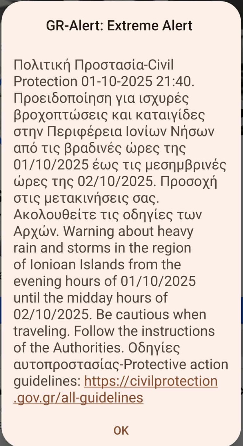 Προειδοποιητικό μήνυμα από το 112 έλαβαν το βράδυ της Τετάρτης οι κάτοικοι της Κεφαλονιάς. Η Πολιτική Προστασία καλεί τους πολίτες να είναι ιδιαίτερα προσεκτικοί, καθώς σύμφωνα με τις προβλέψεις αναμένονται ισχυρές βροχοπτώσεις από το βράδυ της Τετάρτης 1ης Οκτωβρίου έως και το μεσημέρι της Πέμπτης 2 Οκτωβρίου.