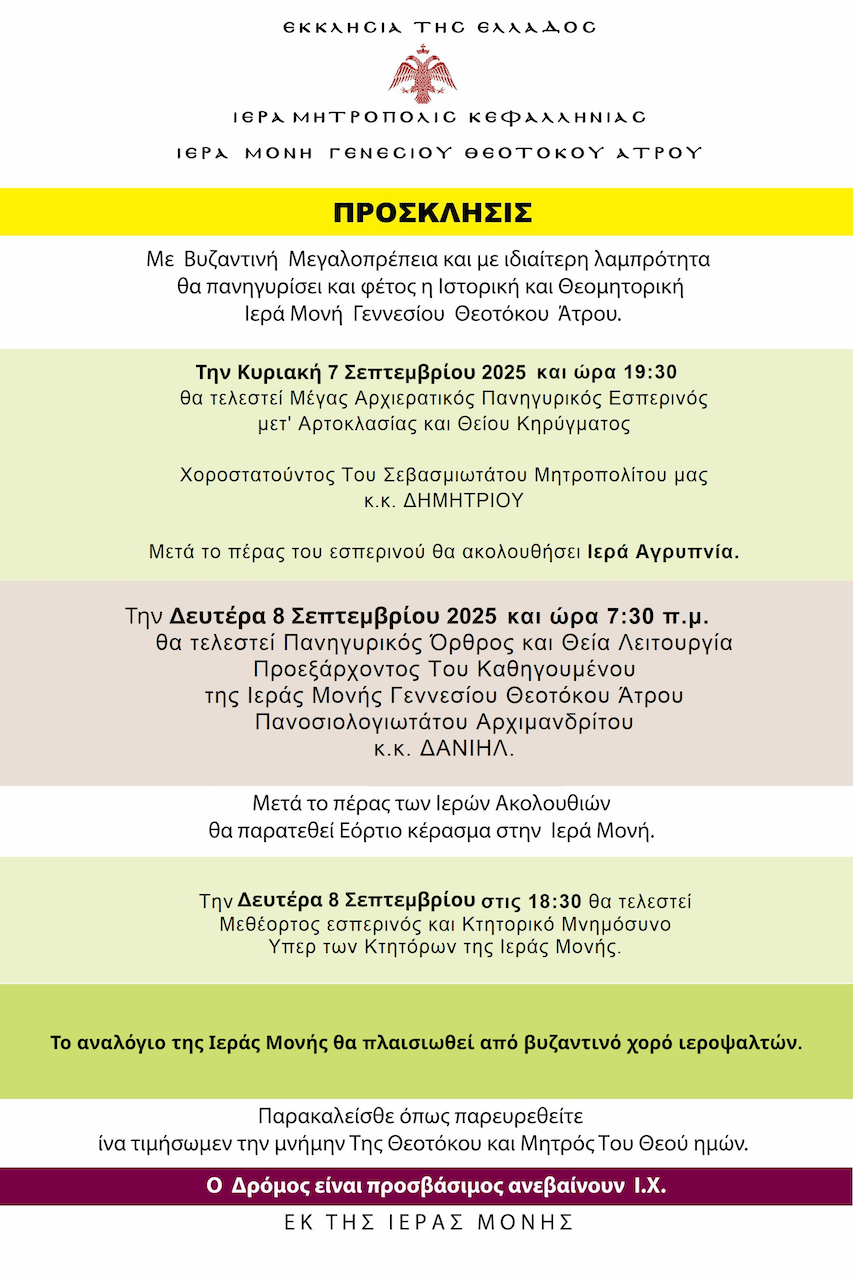Πρόγραμμα Εορτής Ι.Ν. Γενεσίου Θεοτόκου Αυλακιώτισσας στα Λειβαθηνάτα
