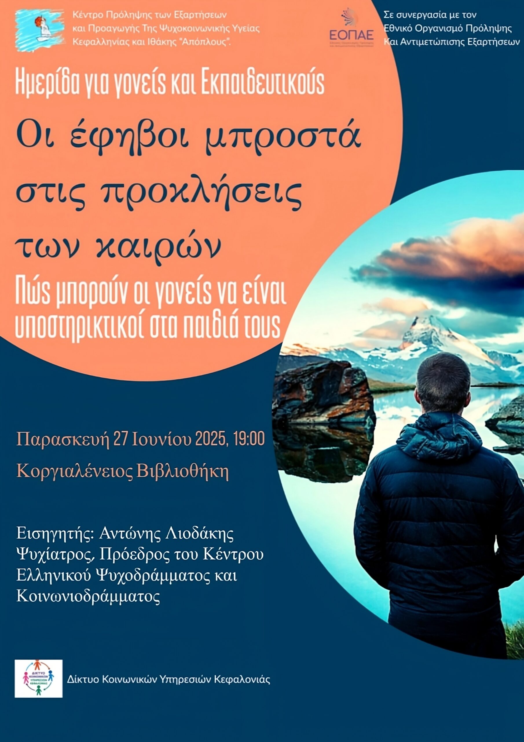 «Οι έφηβοι μπροστά στις προκλήσεις των καιρών. Πως μπορούν οι γονείς να είναι υποστηρικτικοί στα παιδιά τους» με ομιλητή τον ψυχίατρο και Πρόεδρο του Κέντρου Ελληνικού ψυχοδράματος και κοινωνιοδράματος κο Αντώνη Λιοδάκη που θα πραγματοποιηθεί την Παρασκευή 27 Ιουνίου 2025 και ώρα 19:00 στην Κοργιαλένειο Βιβλιοθήκη Αργοστολίου.