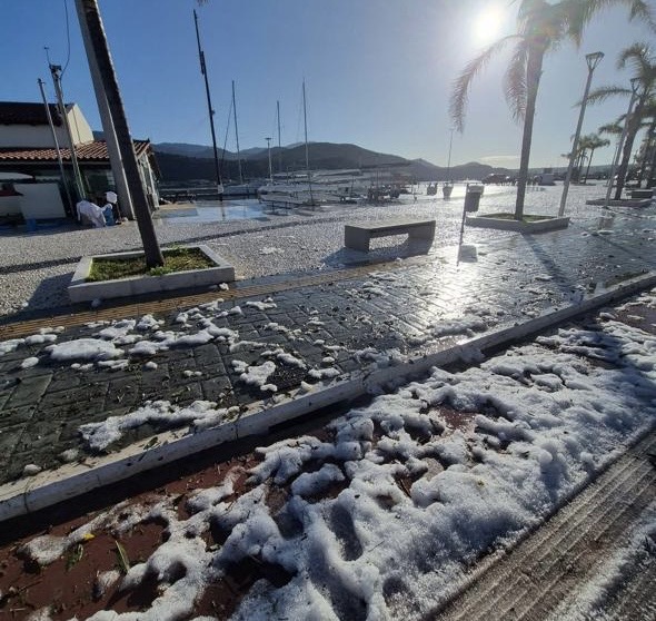 Σε άλλο σημείο της πόλης η έντονη χαλαζόπτωση δημιούργησε ένα μεγάλο στρώμα χαλαζιού.
