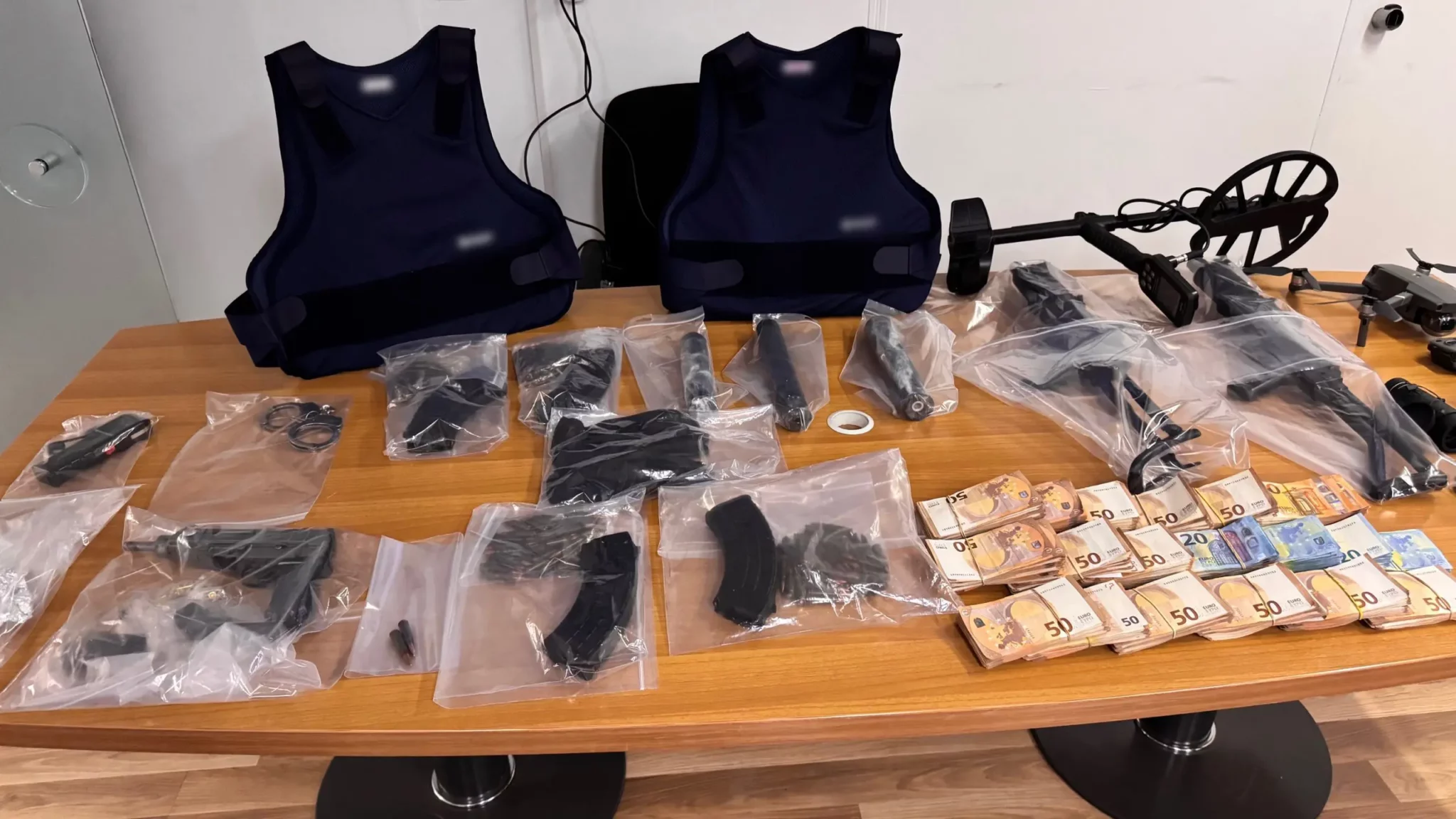 Οι κατηγορούμενοι συνελήφθησαν στα σπίτια τους στη Νέα Σμύρνη και το Περιστέρι όπου οι αστυνομικοί εντόπισαν, μεταξύ άλλων, ένα πυροβόλο όπλο, δύο τυφέκια Καλάζνικοφ, δύο αλεξίσφαιρα γιλέκα, σιγαστήρες, ναρκωτικά και 79.500 ευρώ.