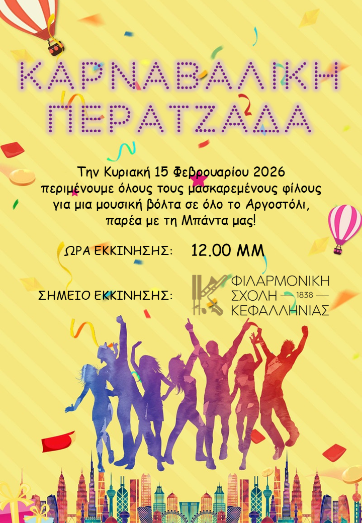 Η Φιλαρμονική Σχολή Κεφαλληνίας διοργανώνει καρναβαλική περατζάδα στο Αργοστόλι, με τη Μπάντα της!