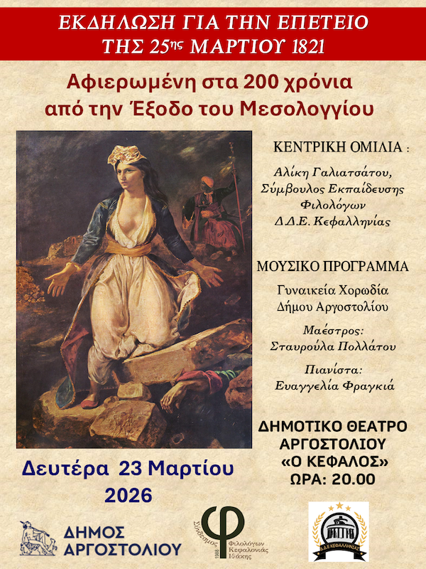 Με ιδιαίτερη χαρά σας προσκαλούμε στην Εκδήλωση για τον εορτασμό της εθνικής επετείου της 25ης Μαρτίου 1821 , την οποία συνδιοργανώνουμε με τον Δήμο Αργοστολίου και τη Διεύθυνση Δευτεροβάθμιας Εκπαίδευσης Κεφαλληνίας την Δευτέρα 23 Μαρτίου 2026 στις 20.00 στο Δημοτικό Θέατρο Αργοστολίου «Ο ΚΕΦΑΛΟΣ»
