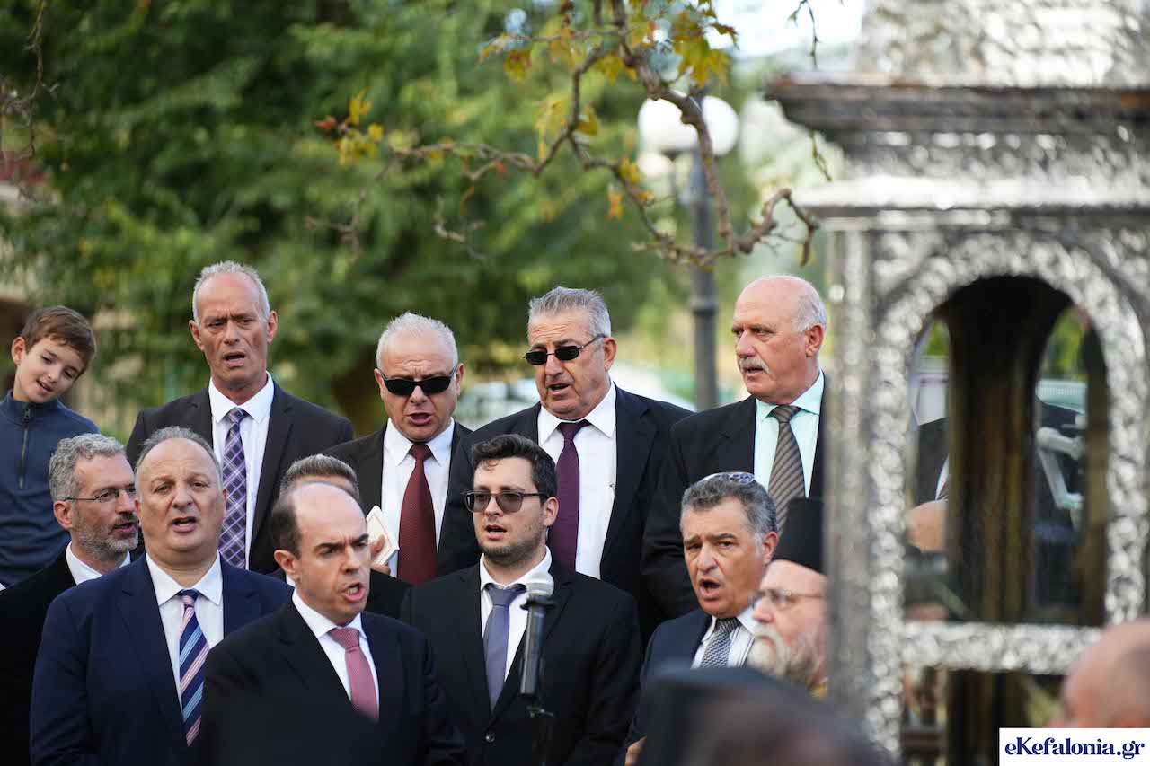 Και φέτος, είχαμε δύο κεφαλονίτικες χορωδίες να ψάλλουν στο Πανηγύρι, στη μεγάλη εκκλησία του Αγίου μας. Πρόκειται για τη γνωστή εκκλησιαστική χορωδία του Αργοστολίου με Χοράρχη τον Βασίλειο Καλογηρά και την εκκλησιαστική χορωδία από το Ληξούρι με Χοράρχη τον Νικόλαο Βάλσαμο, λαμπρό νομικό Αθηνών και Διευθυντή της εκκλησιαστικής χορωδίας Αγίου Γεωργίου Καρίτση στην Αθήνα.