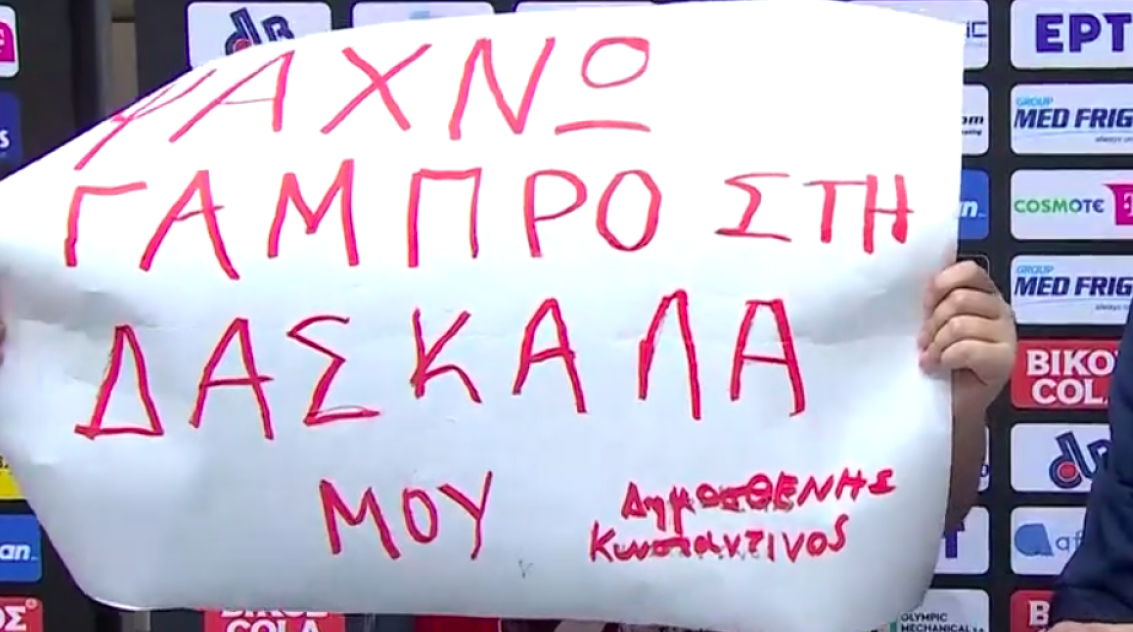 Για την ιστορία, ο μικρός Δημοσθένης ταξίδεψε στην Πάτρα με την οικογένειά του για να παρακολουθήσει από κοντά τον αγαπημένο του Ολυμπιακό απέναντι στον Προμηθέα. Και μπορεί οι μεγάλοι να ασχολούνταν με τα τρίποντα και τις άμυνες, αλλά εκείνος κατάφερε να κλέψει την παράσταση με μια μόνο πινακίδα.