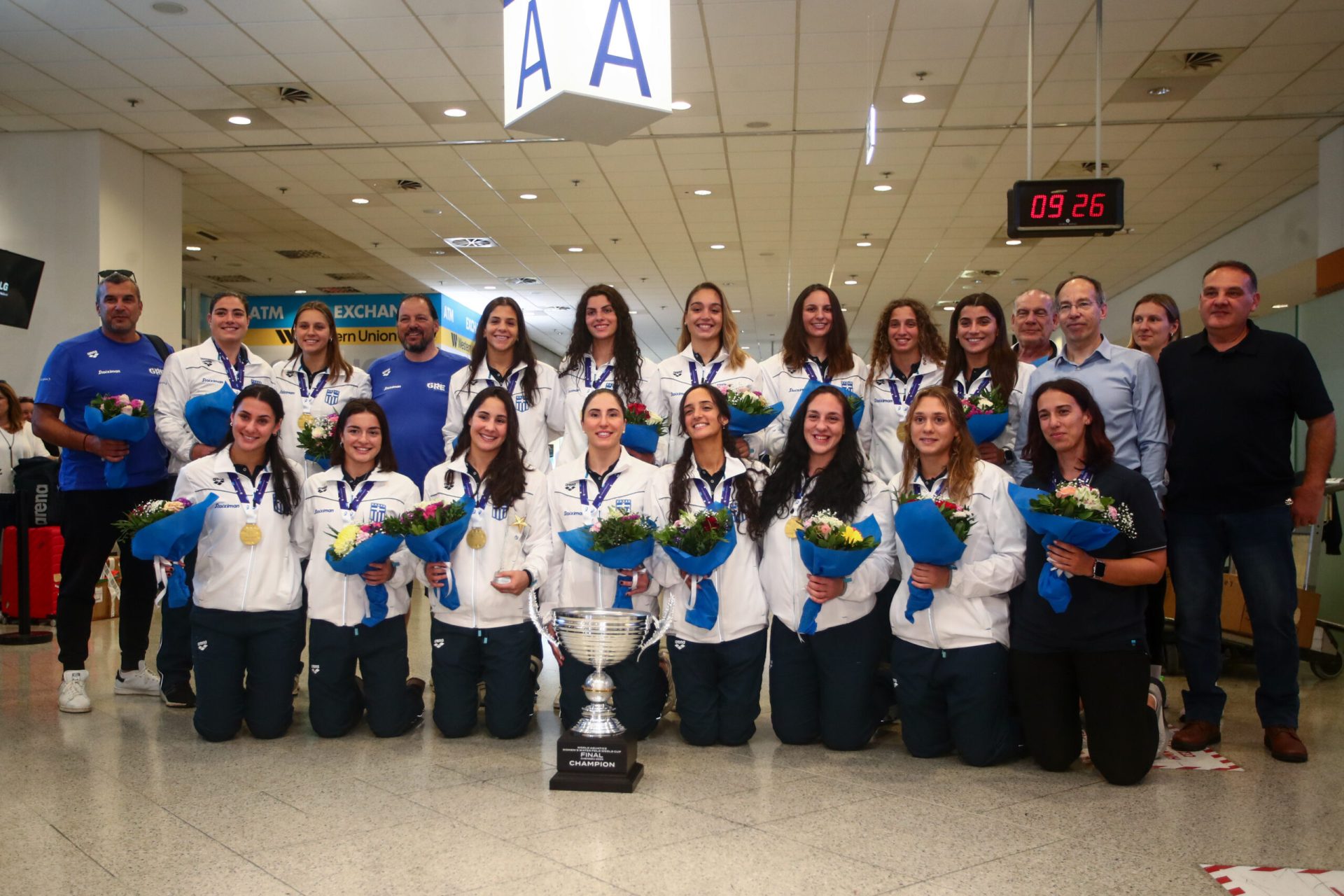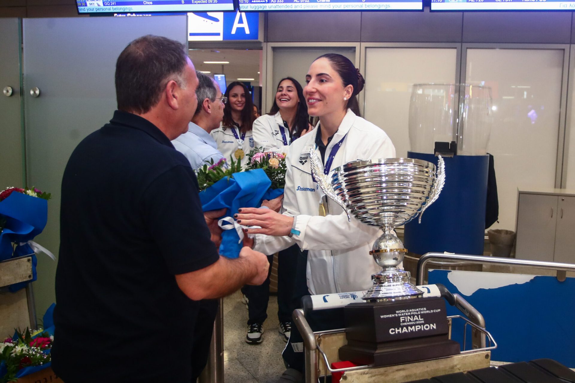 Τα χρυσά κορίτσια του πόλο που ανέβηκαν στο ψηλότερο σκαλί του Παγκοσμίου Κυπέλλου και έγραψαν με «χρυσά» γράμματα το όνομα της Ελλάδας, επέστρεψαν στο αεροδρόμιο Ελευθέριος Βενιζέλος και έκαναν δηλώσεις κρατώντας στα χέρια την πολύτιμη κούπα.