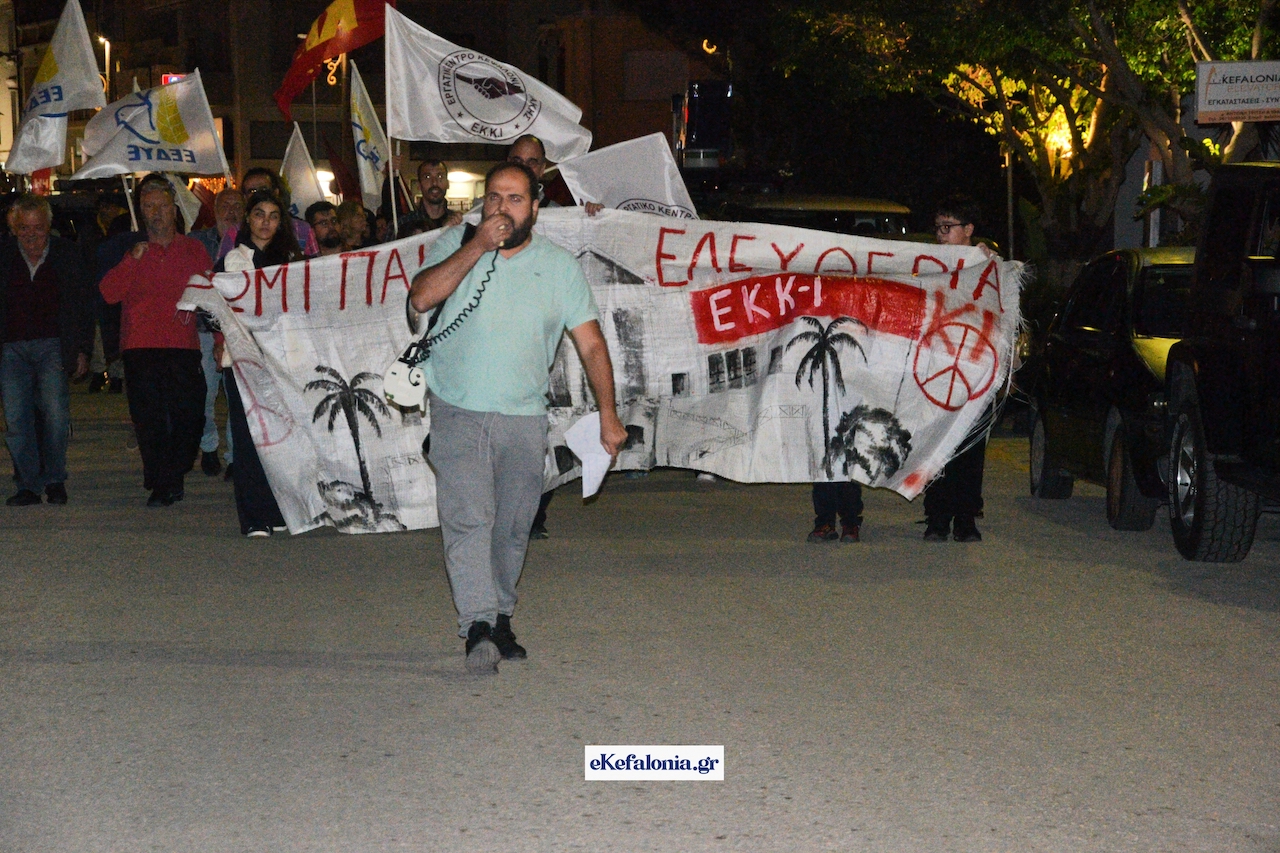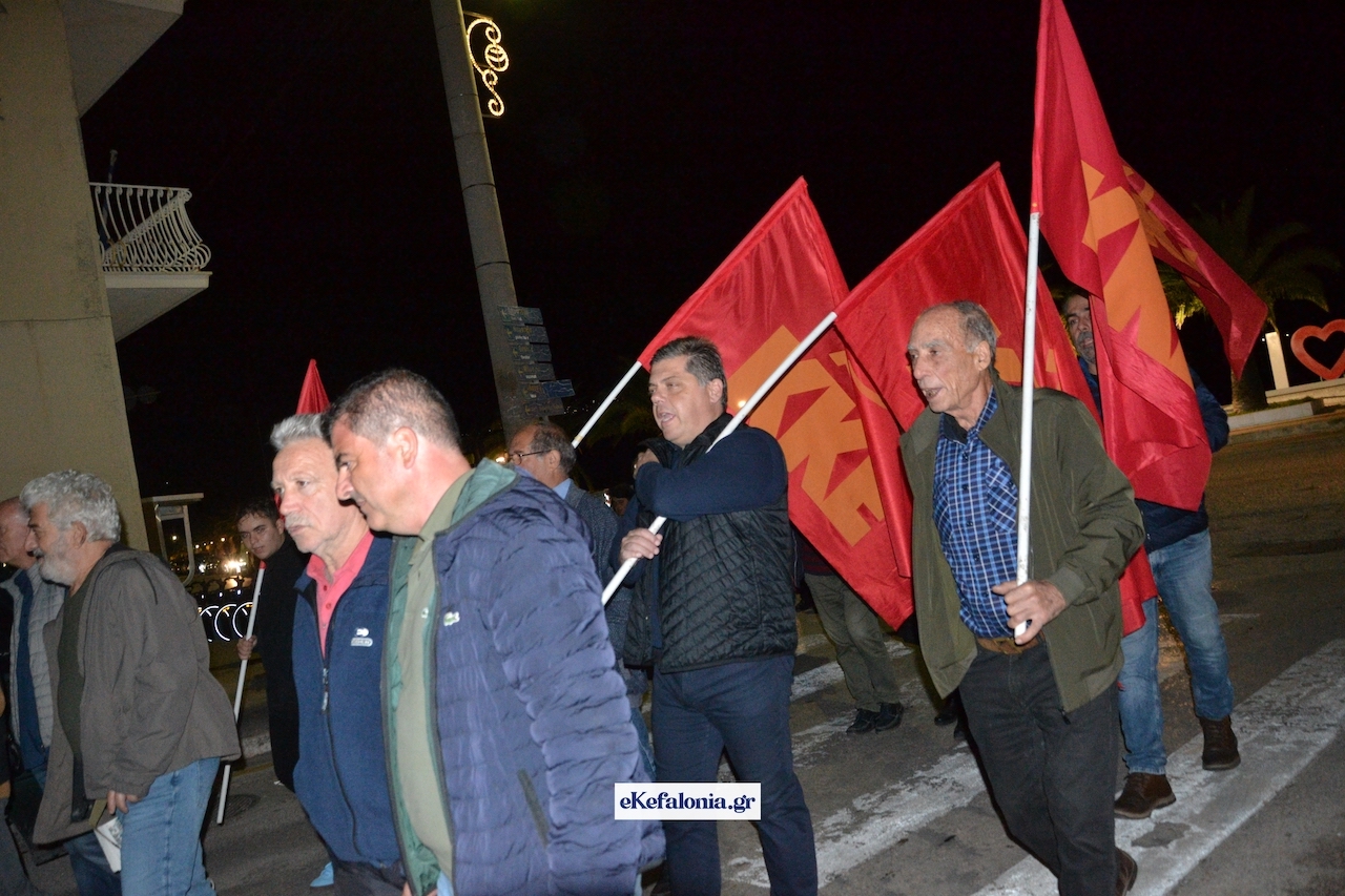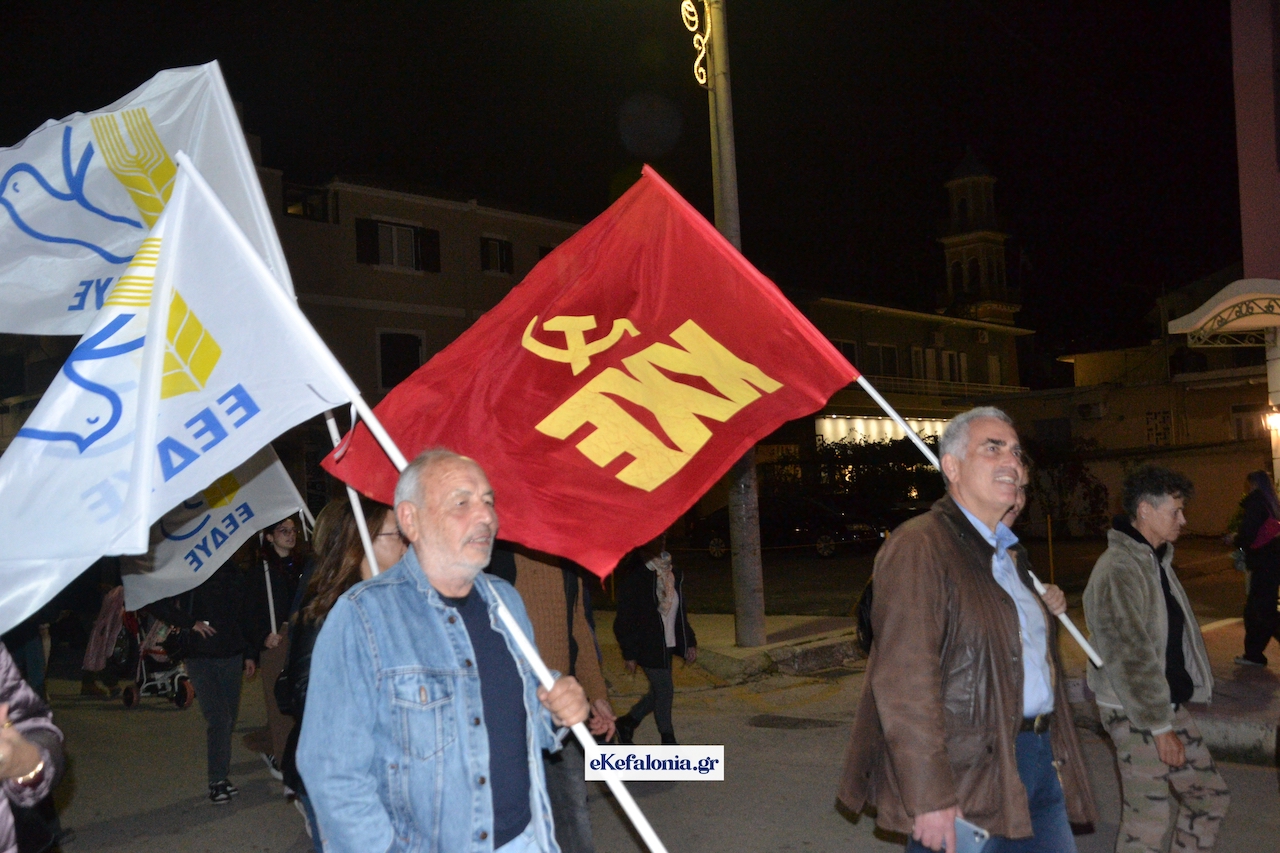 Ακολούθησε πορεία στους δρόμους του Αργοστολίου με τους συμμετέχοντες να φωνάζουν συνθήματα κρατώντας πανό και σημαίες του ΚΚΕ και της Παλαιστίνης.
