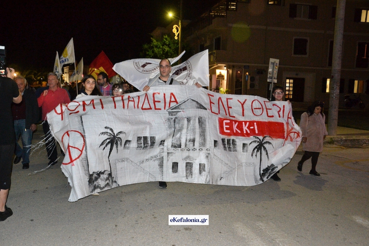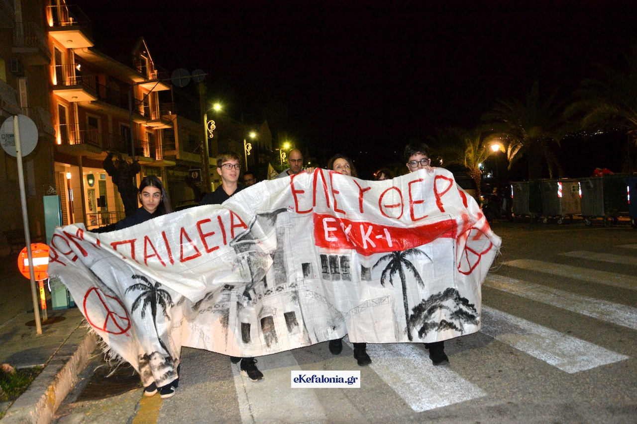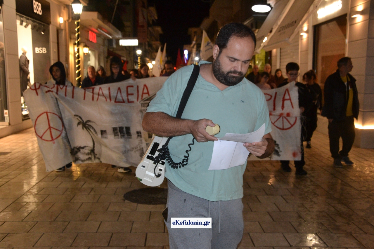 Ακολούθησε πορεία στους δρόμους του Αργοστολίου με τους συμμετέχοντες να φωνάζουν συνθήματα κρατώντας πανό και σημαίες του ΚΚΕ και της Παλαιστίνης.
