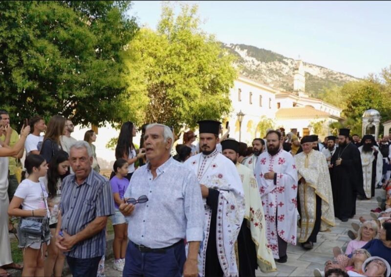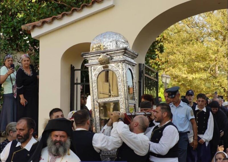 Ακολούθησε μικρά λιτάνευση του σκηνώματος του Αγίου μας στη μεγάλη εκκλησία του μοναστηριού με τις καμπάνες να χτυπούν χαρμόσυνα. Σε λίγη ώρα θα ακολουθήσει λαμπρός πολυαρχιερατικός εσπερινός.