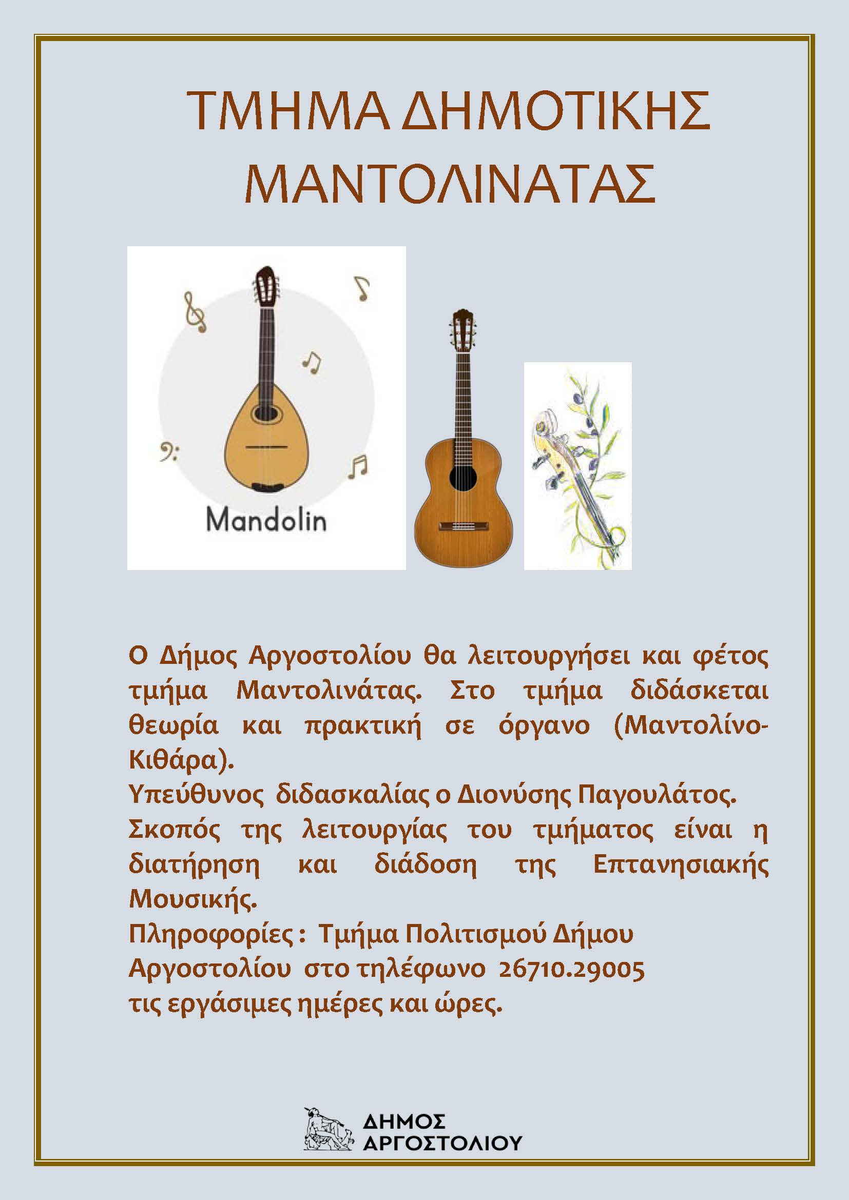 Σας ενημερώνουμε ότι ο Δήμος Αργοστολίου θα λειτουργήσει και φέτος Τμήμα ΜΑΝΤΟΛΙΝΑΤΑΣ. Στο τμήμα διδάσκεται θεωρία και πρακτική σε όργανο (Μαντολίνο-Κιθάρα).