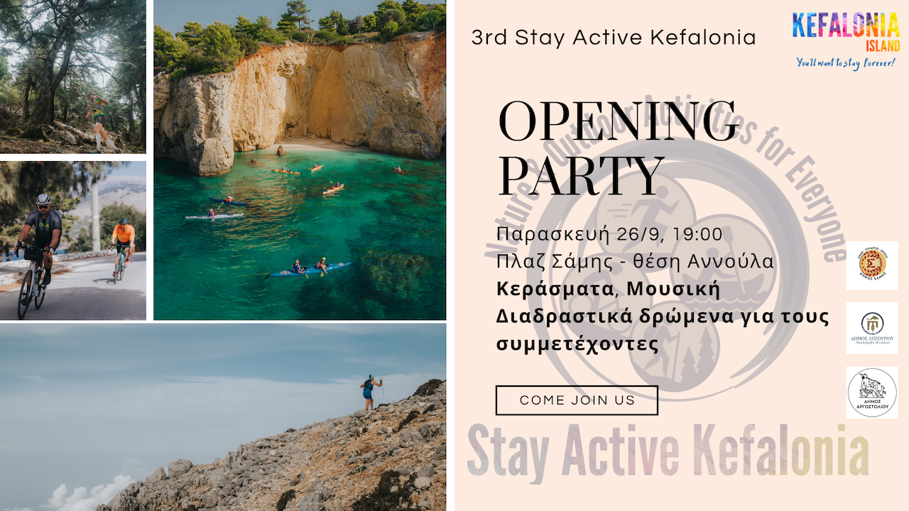 Οι Δήμοι της Κεφαλονιάς υποδέχονται, για τρίτη συνεχή χρονιά, την καθιερωμένη πλέον διοργάνωση Stay Active Kefalonia από τις 26 έως τις 28 Σεπτεμβρίου 2025, προσκαλώντας όλη την οικογένεια να γνωρίσει την Κεφαλονιά μέσα από μια τεράστια γκάμα υπαίθριων δραστηριοτήτων και εκδηλώσεων.