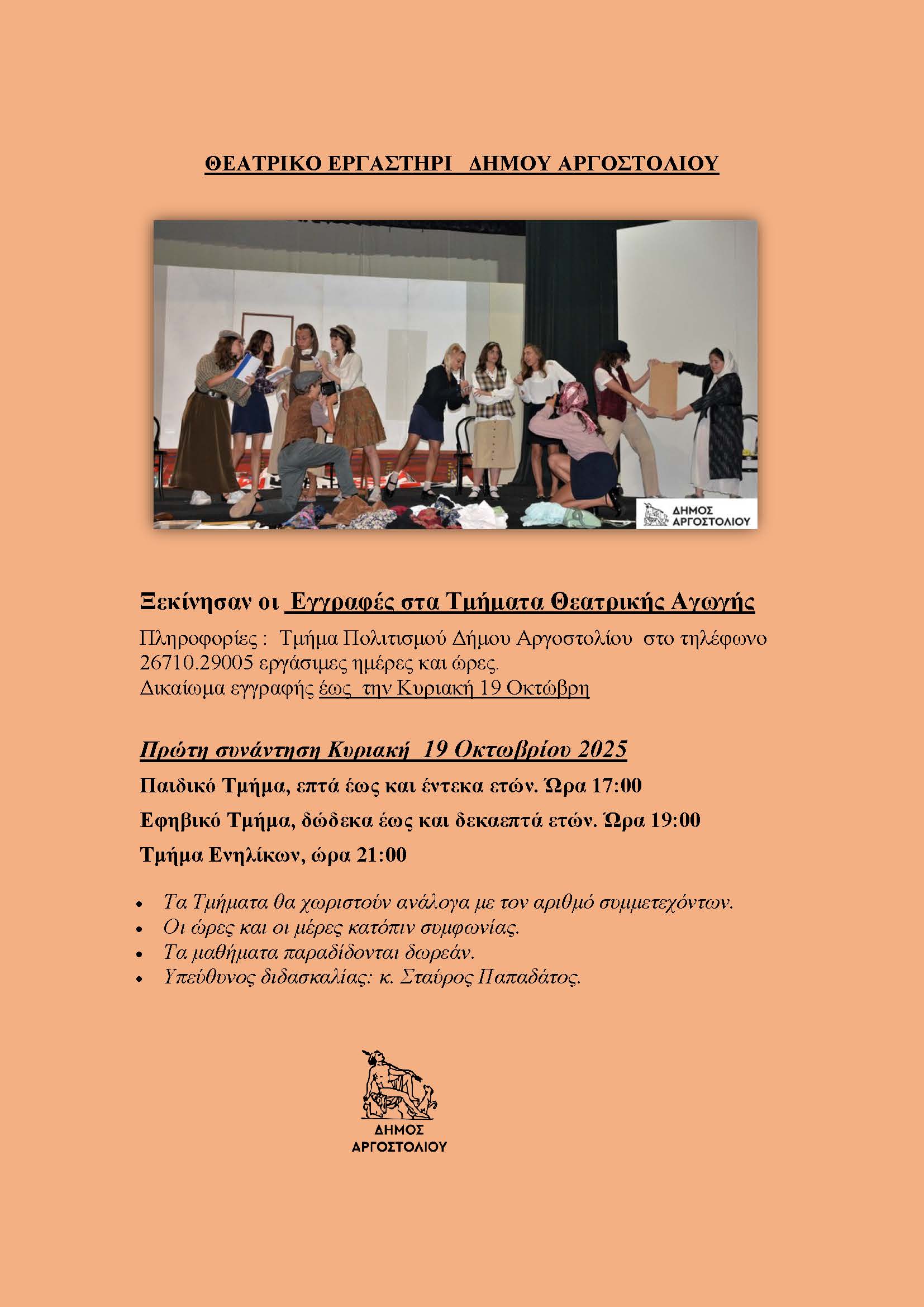 Ξεκίνησαν οι εγγραφές στα Tμήματα Θεατρικής Αγωγής του Δήμου Αργοστολίου