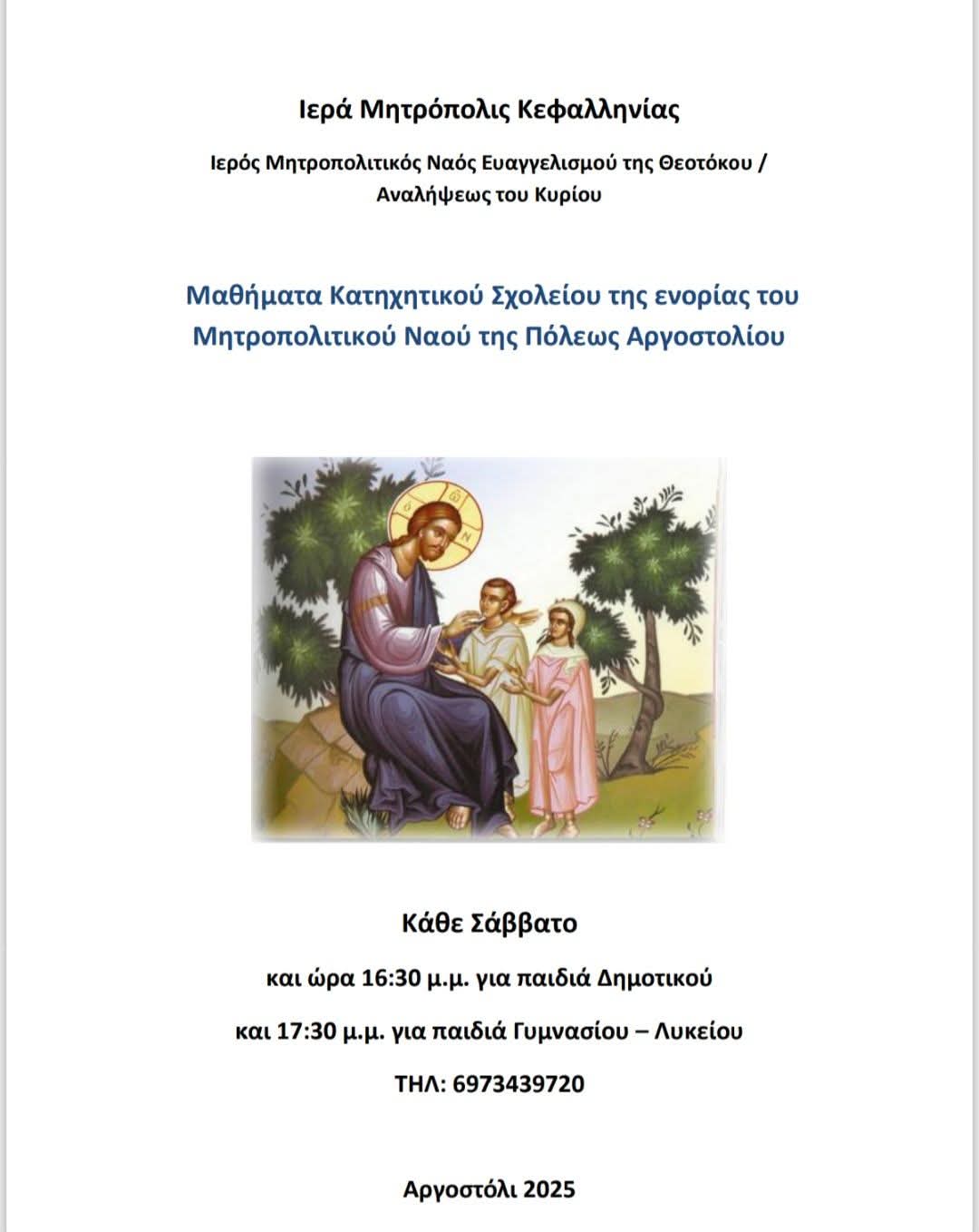 Ξεκινούν τα Μαθήματα του Κατηχητικού Σχολείου στον Μητροπολιτικό Ναό Αργοστολίου