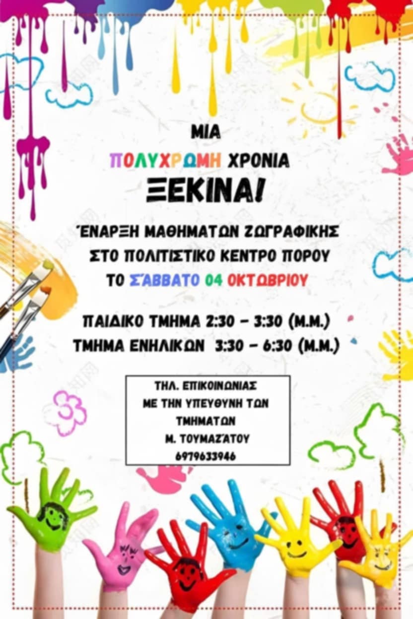 Όπως γράφει η αφίσα των μαθημάτων ζωγραφικής στο Πολιτιστικό Κέντρο του Πόρου με υπεύθυνη των τμημάτων την Μαρία Τουμαζάτου: Μια πολύχρωμη χρονιά ξεκινά!