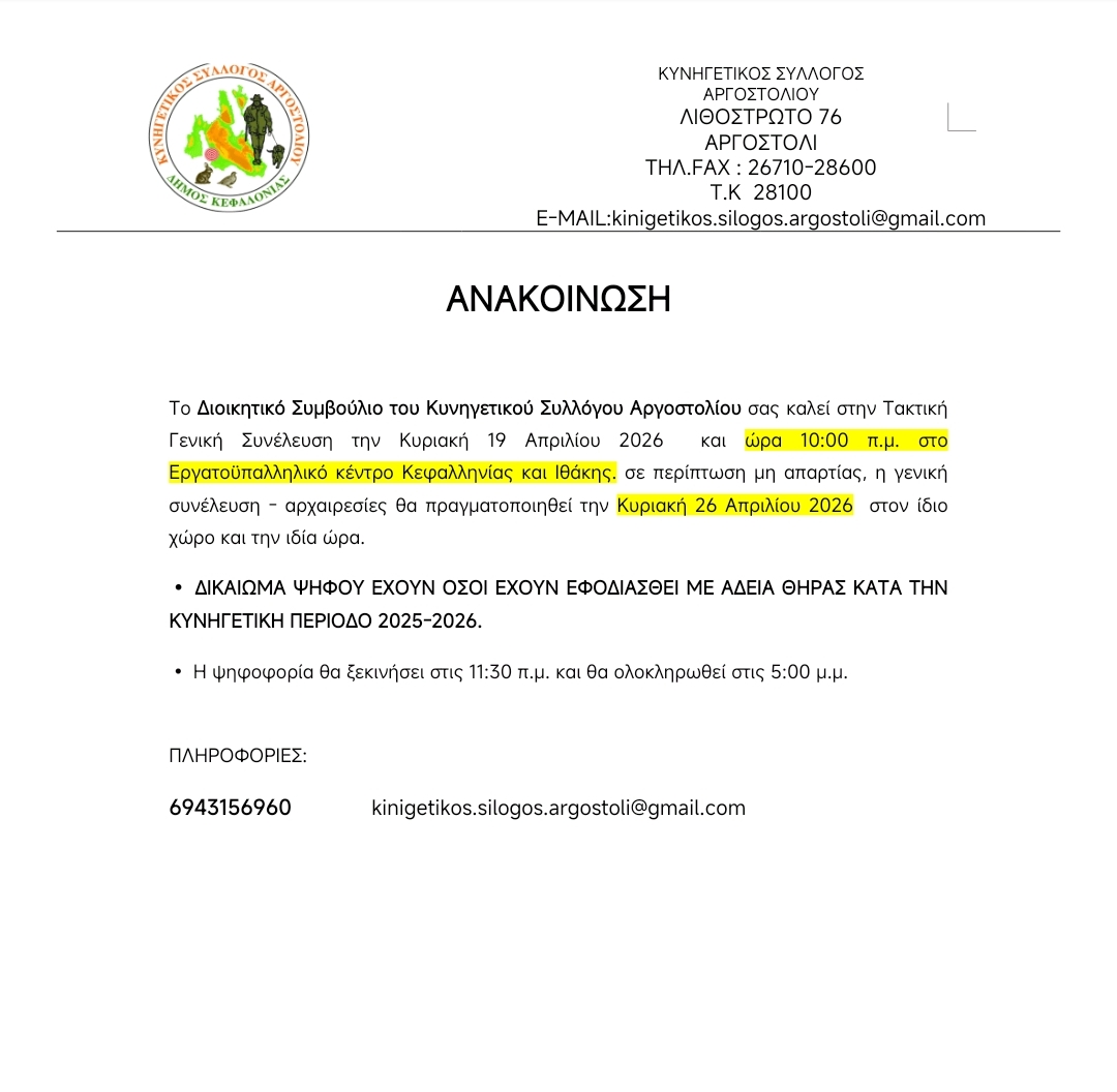 Κυνηγετικός Σύλλογος Αργοστολίου: Τακτική Γενική Συνέλευση στις 19 Απριλίου