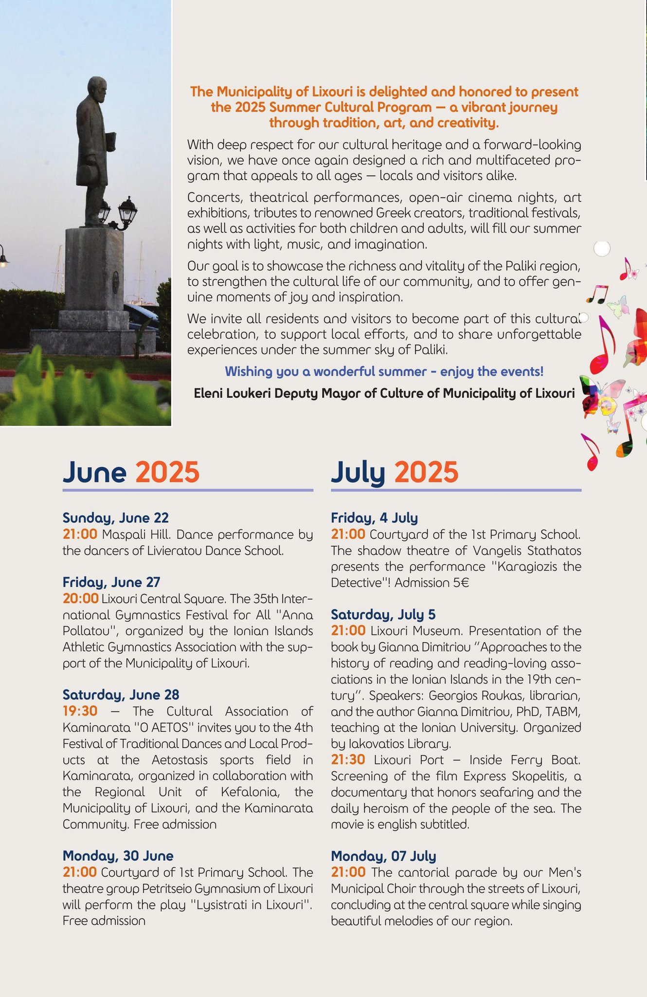 Ένα πλούσιο και πολυσυλλεκτικό Θερινό Πολιτιστικό Πρόγραμμα για το 2025 παρουσιάζει φέτος ο Δήμος Ληξουρίου, υπό την επιμέλεια της Αντιδημάρχου Πολιτισμού Ελένης Λουκέρη. Η φετινή «πολιτιστική διαδρομή» της Παλικής συνδυάζει εκδηλώσεις υψηλού επιπέδου με παραδοσιακά πανηγύρια, εκθέσεις, θεατρικές παραστάσεις και δράσεις για μικρούς και μεγάλους.
