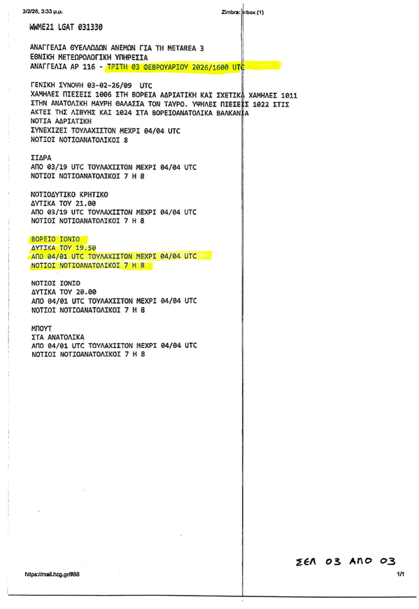 1. Σε εκτέλεση ανωτέρω σχετικής αναμεταβιβάζεται συνημμένα το από 03-02-2026/16:00 U.T.C. – A.A. 116/2026 Δελτίο Αναγγελίας Θυελλωδών Ανέμων ΕΜΥ/Ε.Μ.Κ. που αφορά θαλάσσια περιοχή δικαιοδοσίας μας και παρακαλούμε για την ενημέρωσή σας.