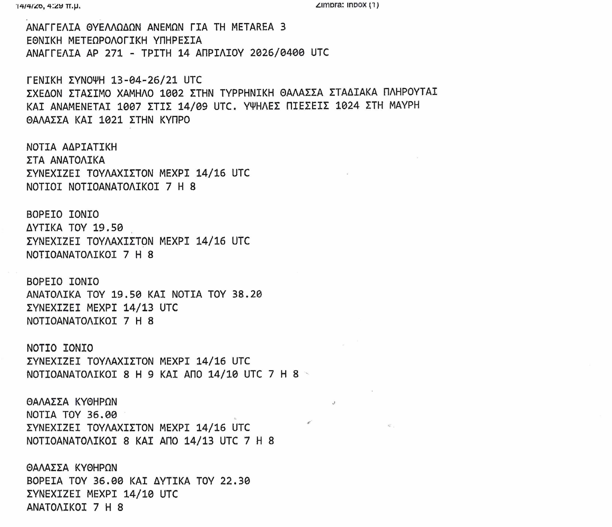 1. Σε εκτέλεση ανωτέρω σχετικών αναμεταβιβάζεται συνημμένα η Αρ. 271/2026/14-04-2026/0400 UTC Αναγγελία θυελλωδών ανέμων της Ε.Μ.Υ. που αφορά θαλάσσια περιοχή δικαιοδοσίας μας και παρακαλούμε για την ενημέρωσή σας.