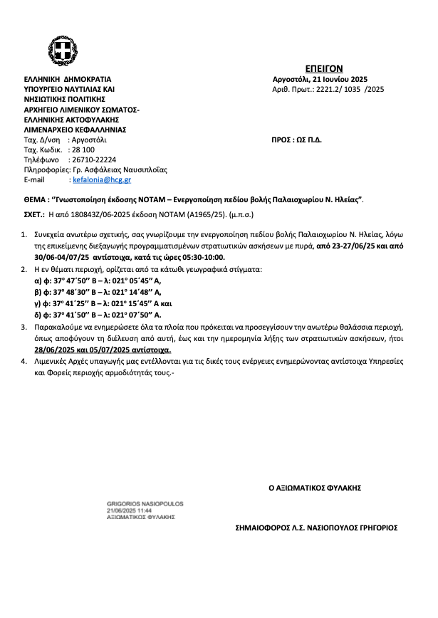 Λιμεναρχείο Κεφαλονιάς: ΝΟΤΑΜ λόγω πραγματικών πυρών σε πεδίο βολής στο Παλαιοχώρι Ηλείας