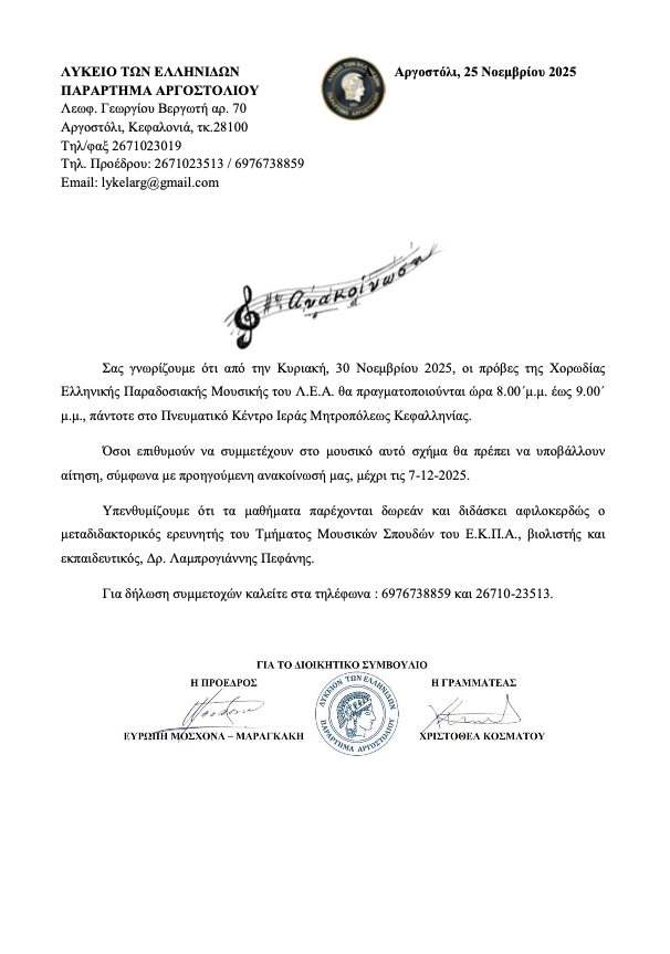 Λύκειο Ελληνίδων Αργοστολίου: Έναρξη προβών της Χορωδίας στις 30 Νοεμβρίου