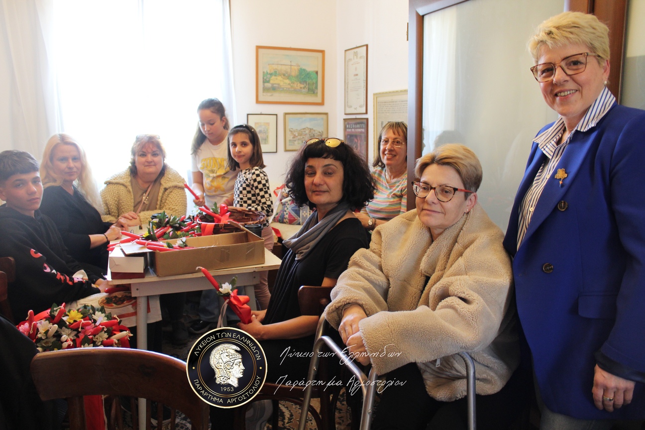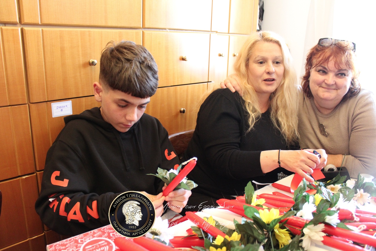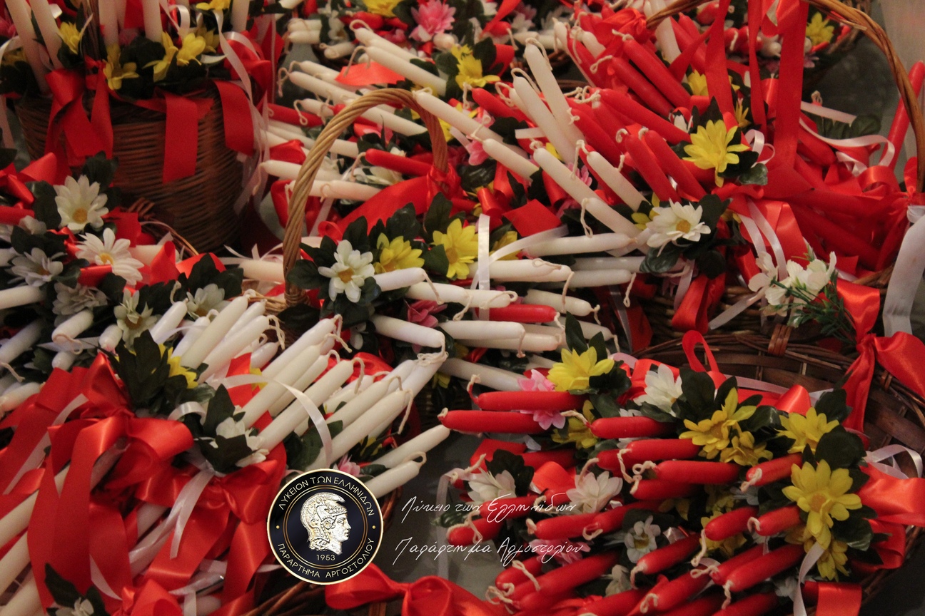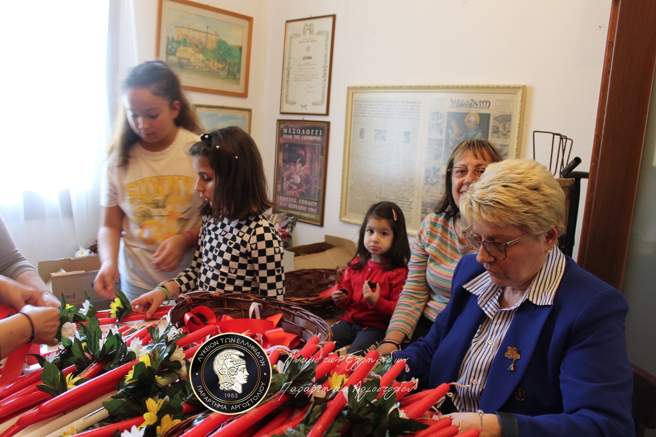 Εμείς στα γραφεία του Λυκείου των Ελληνίδων τη Μεγάλη Τρίτη, σύμφωνα με τον προγραμματισμό μας, στολίσαμε 800 λαμπάδες που θα μοιραστούν στο κοινό. Οι λαμπάδες της Αναστάσεως, τα κεριά, είναι ένα από τα βασικά σύμβολά του Πάσχα. Σύμφωνα με το λαογράφο μας Δ. Λουκάτο, άλλα σύμβολα είναι ο λαγός, το κουνέλι, οι καμπάνες, το αρνί, τα κόκκινα αυγά, το τσουρέκι, τα πυροτεχνήματα, ακόμα και η σημαία μας που δείχνει τον συμβολικό και ιστορικό δεσμό του Πάσχα (Πάσχα = πέρασμα) με τις τύχες του έθνους μας. Ένα ακόμα σύμβολο είναι το στεφάνι της Ανάστασης, αποκορύφωμα προσφοράς λουλουδιών στο Χριστό.