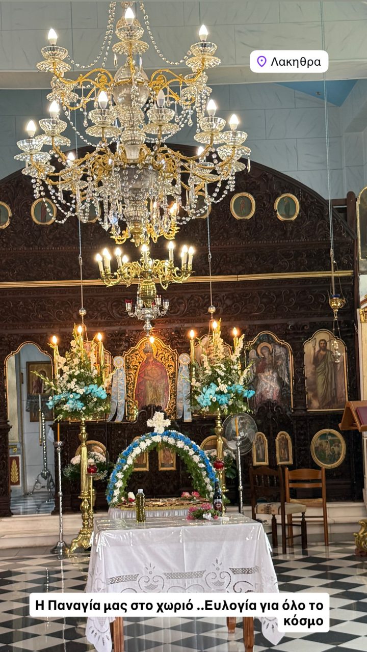 Η παρουσιάστρια του Chase δημοσίευσε τρία στιγμιότυπα από το νησί της και σχολίασε: «Εδώ και φέτος, στο χωριό μου, στην εκκλησία της ζωής μου. Ευχαριστώ την Παναγία που με αξίωσε να έρθω να την προσκυνήσω και να είμαστε όλοι και πάλι εδώ την ίδια ευλογημένη μέρα. Το προάυλιο -εδώ που παίζαμε παιδιά- γέμισε και σήμερα φωνές, ευχές, ζέστες αγκαλιές…