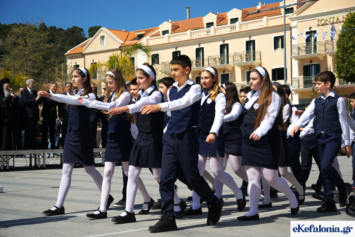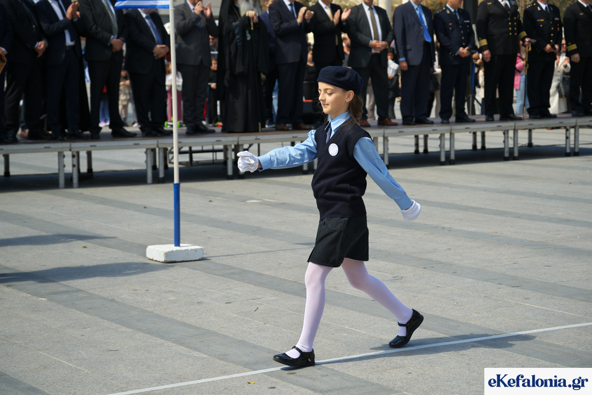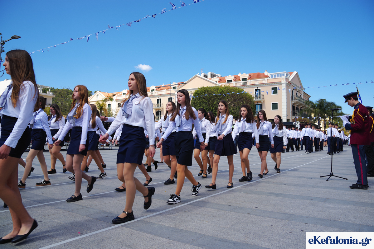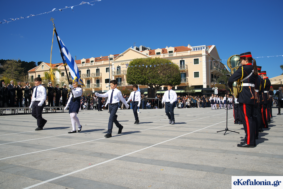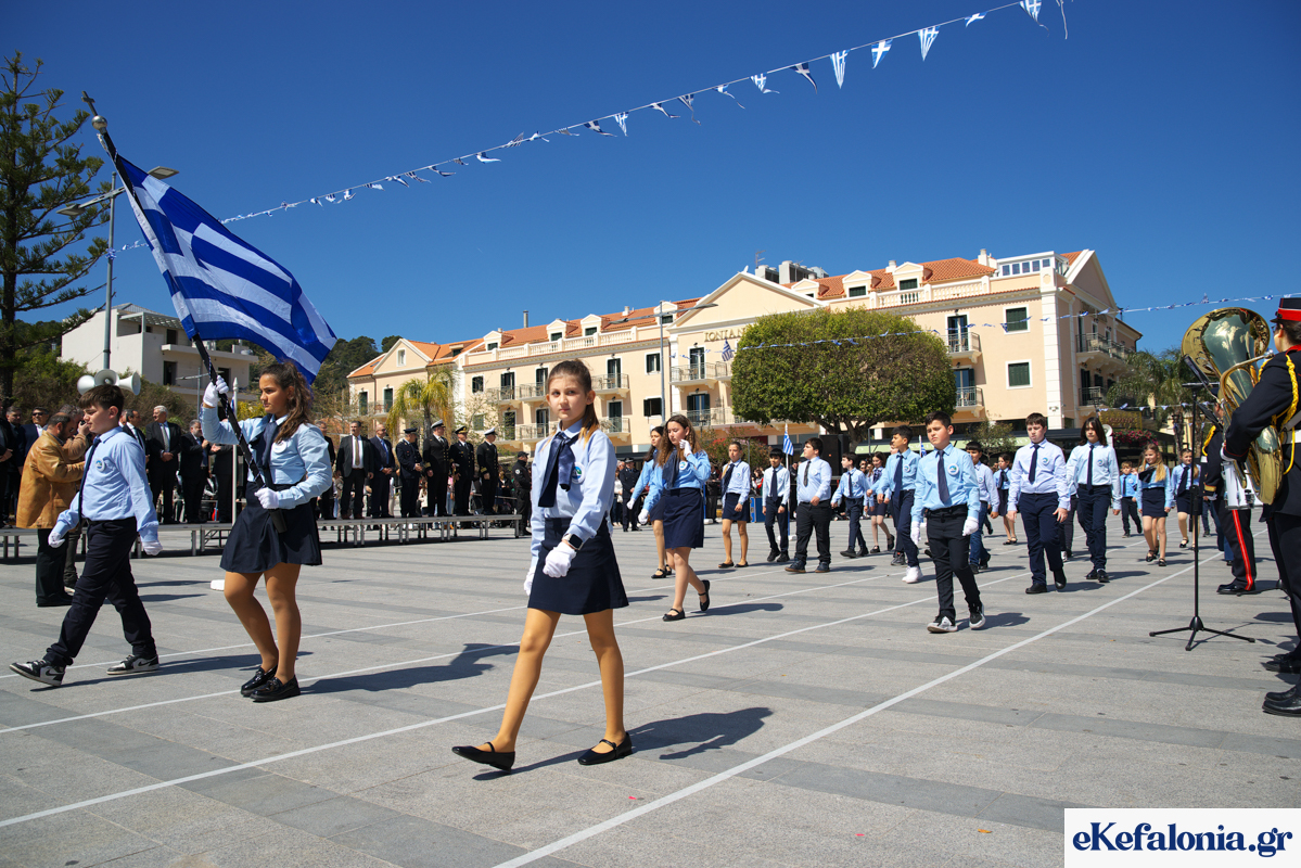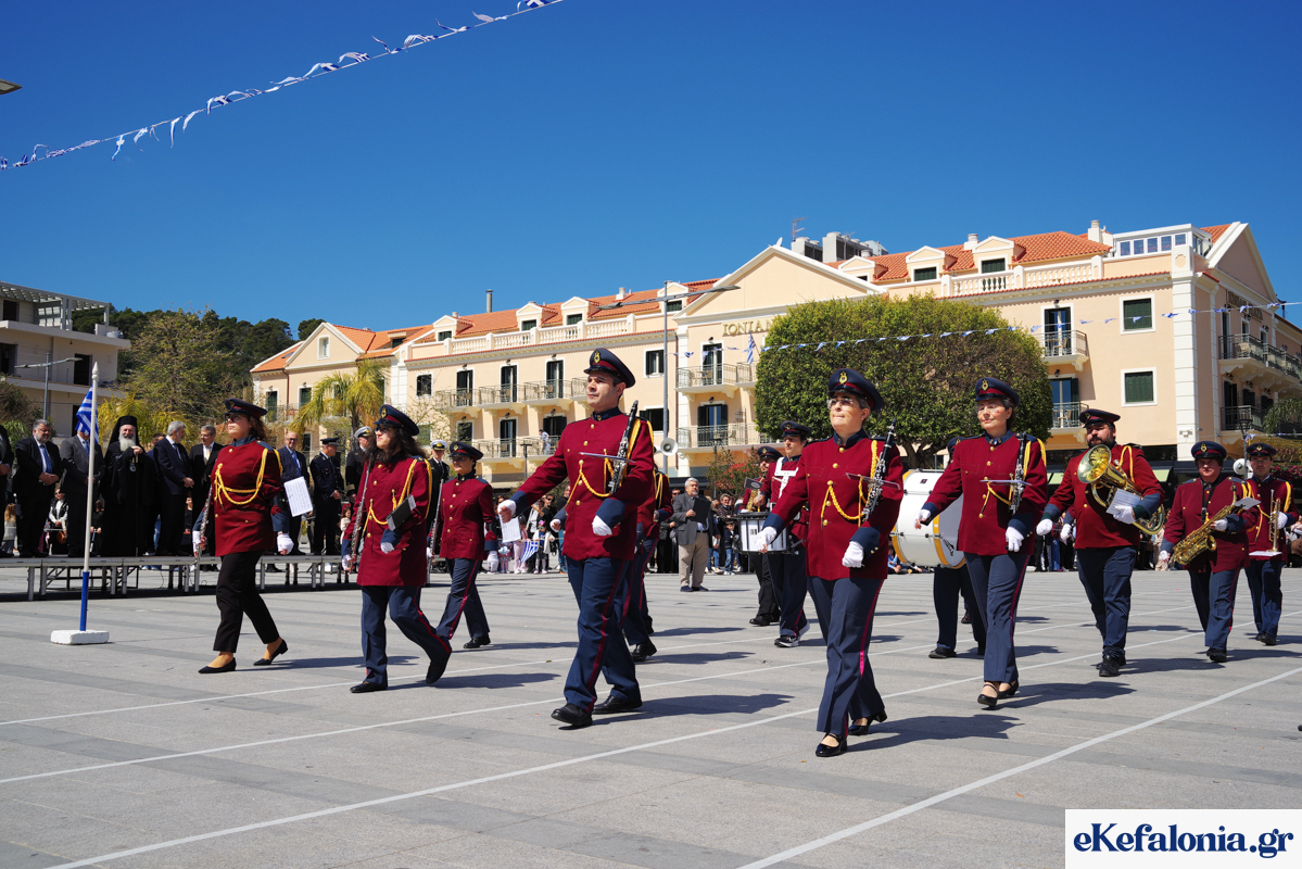 Με την ελληνική σημαία να δεσπόζει, οι μαθητές παρέλασαν με υπερηφάνεια, καταχειροκροτούμενοι από το πλήθος. Τη μουσική επένδυση της παρέλασης ανέλαβαν η Φιλαρμονική του Δήμου Αργοστολίου «Διονύσιος Λαυράγκας» και η Φιλαρμονική Σχολή Κεφαλληνίας, δημιουργώντας μια ατμόσφαιρα εθνικής ανάτασης.