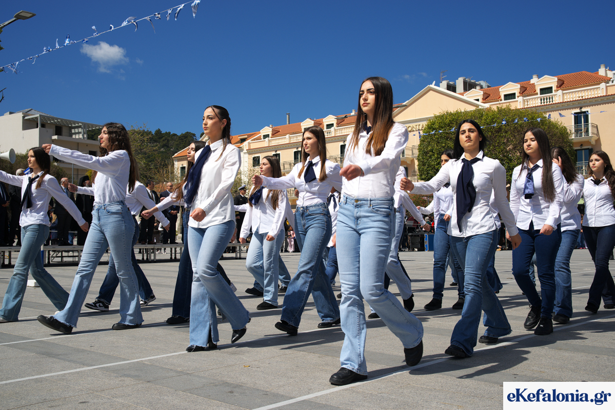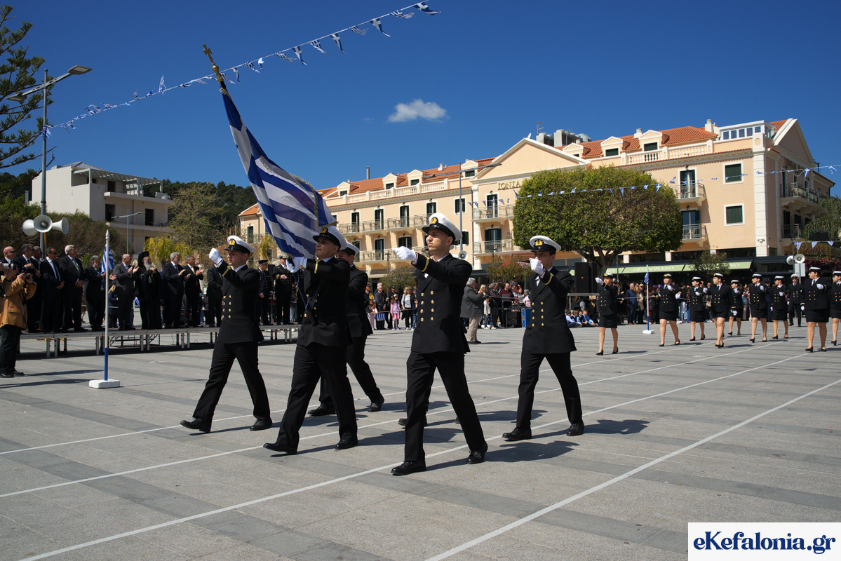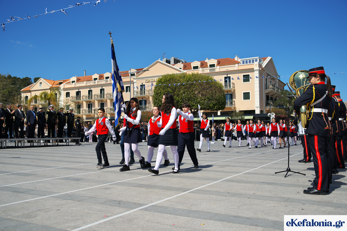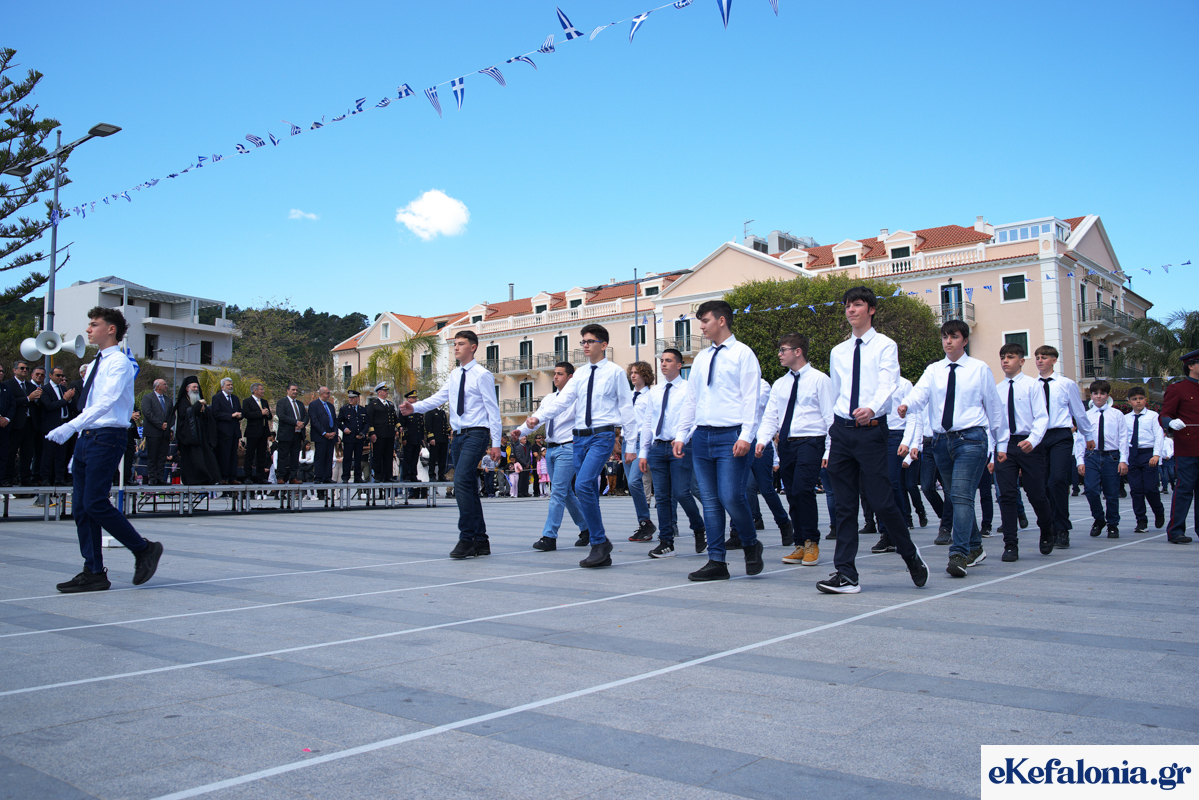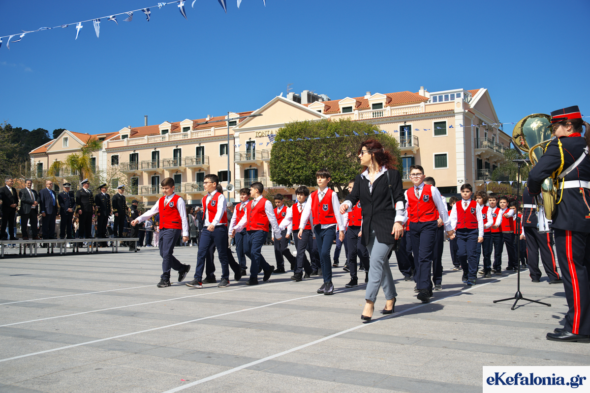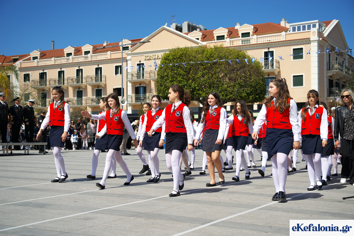 Με την ελληνική σημαία να δεσπόζει, οι μαθητές παρέλασαν με υπερηφάνεια, καταχειροκροτούμενοι από το πλήθος. Τη μουσική επένδυση της παρέλασης ανέλαβαν η Φιλαρμονική του Δήμου Αργοστολίου «Διονύσιος Λαυράγκας» και η Φιλαρμονική Σχολή Κεφαλληνίας, δημιουργώντας μια ατμόσφαιρα εθνικής ανάτασης.