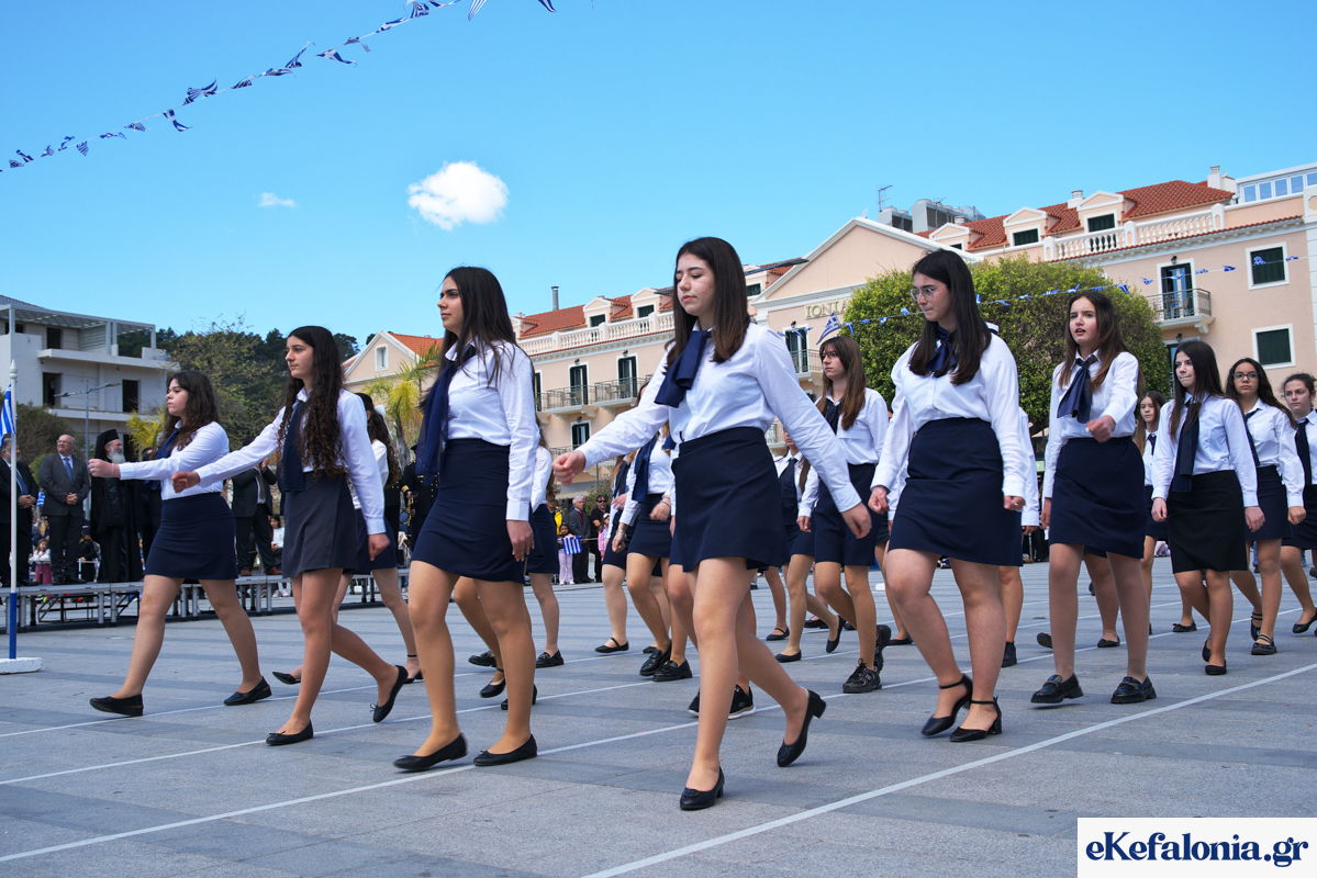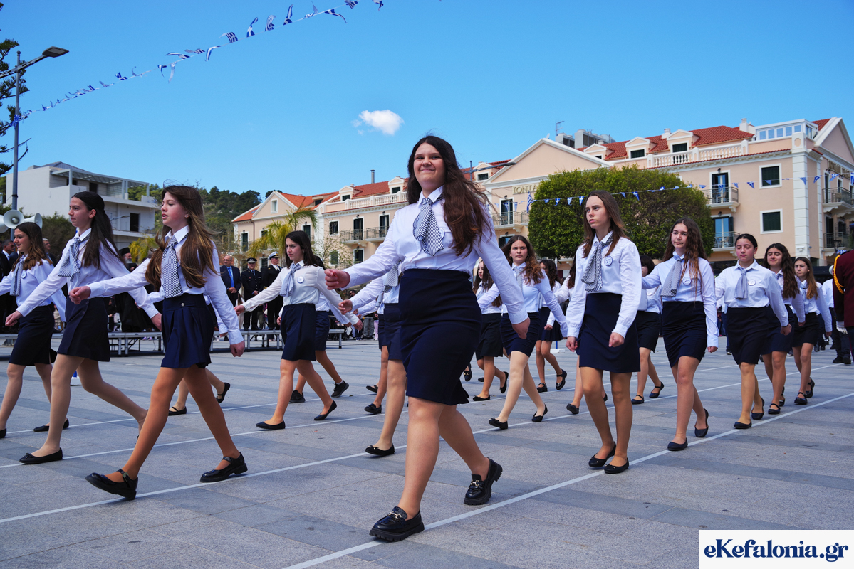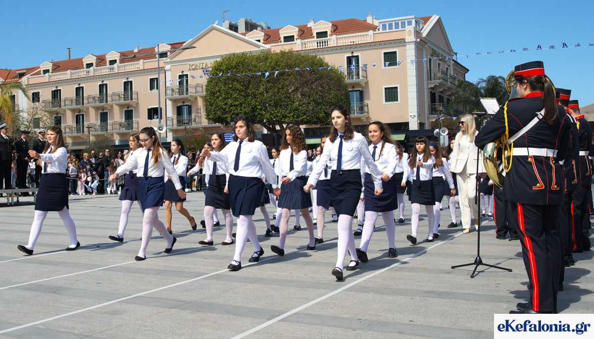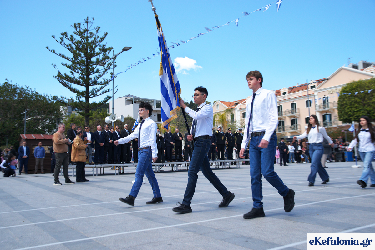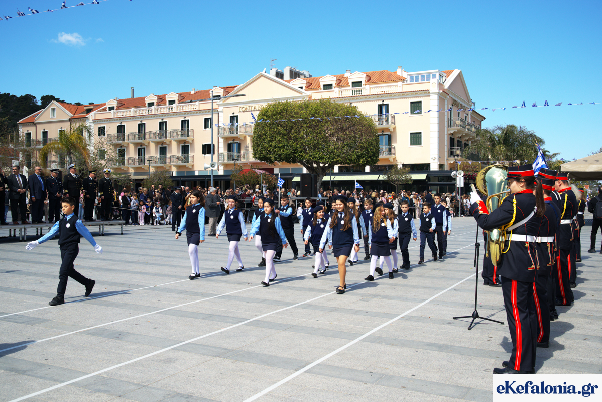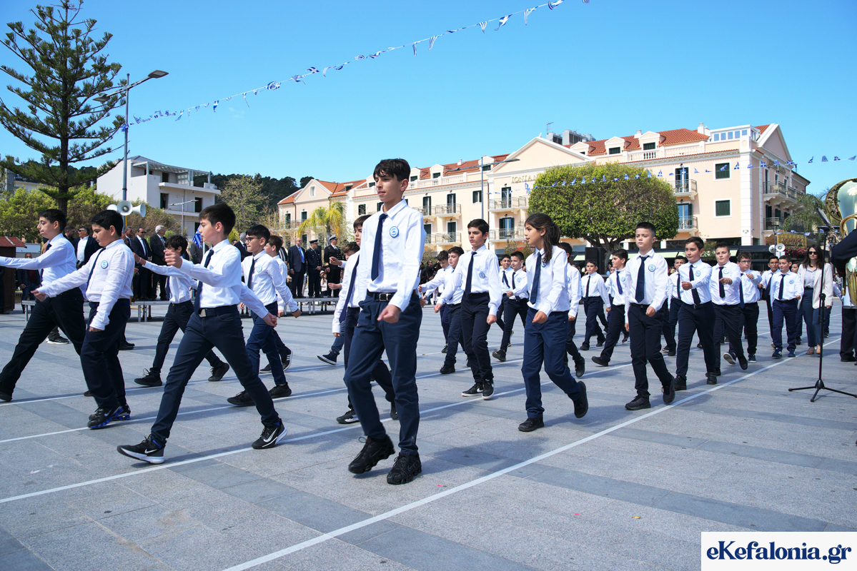 Με την ελληνική σημαία να δεσπόζει, οι μαθητές παρέλασαν με υπερηφάνεια, καταχειροκροτούμενοι από το πλήθος. Τη μουσική επένδυση της παρέλασης ανέλαβαν η Φιλαρμονική του Δήμου Αργοστολίου «Διονύσιος Λαυράγκας» και η Φιλαρμονική Σχολή Κεφαλληνίας, δημιουργώντας μια ατμόσφαιρα εθνικής ανάτασης.