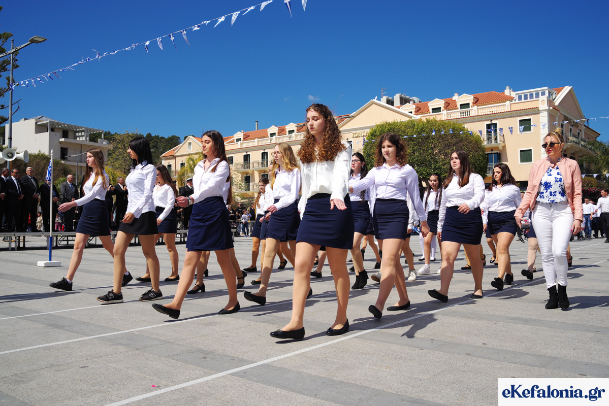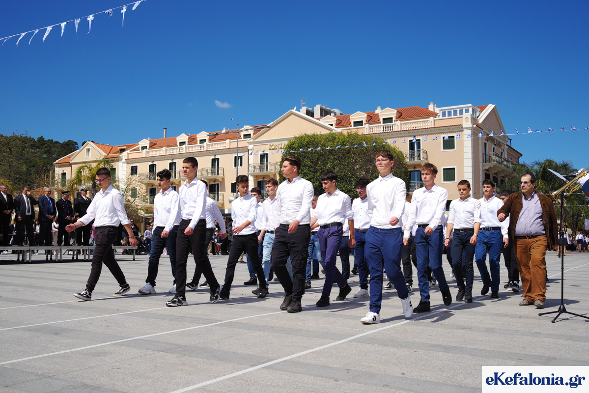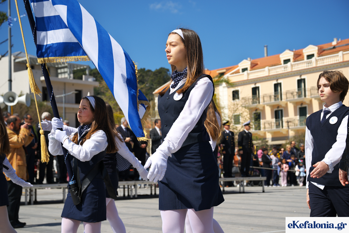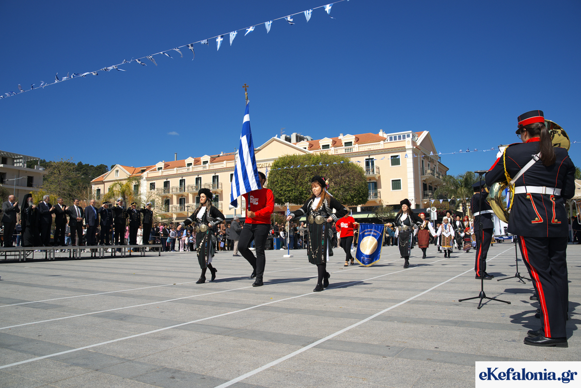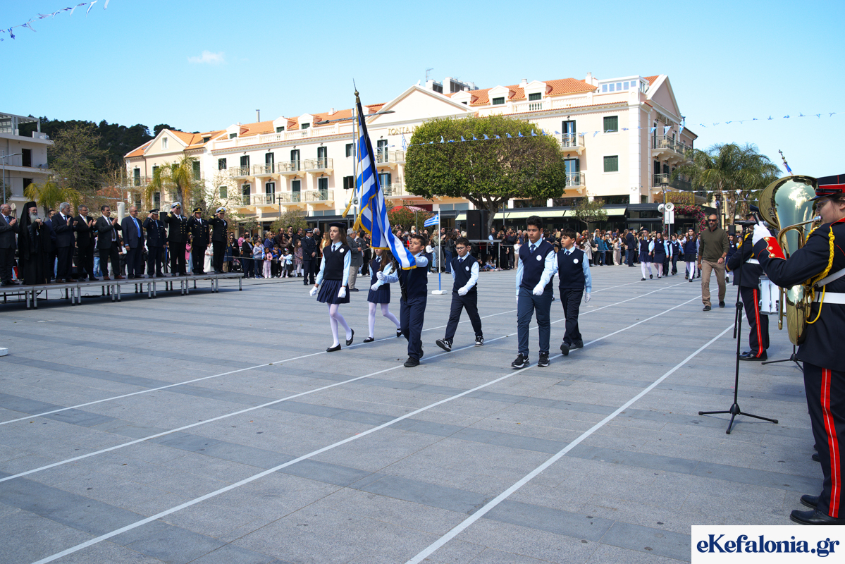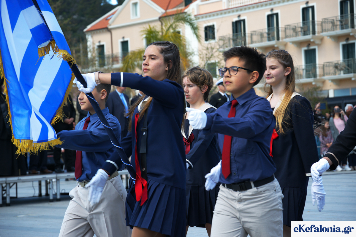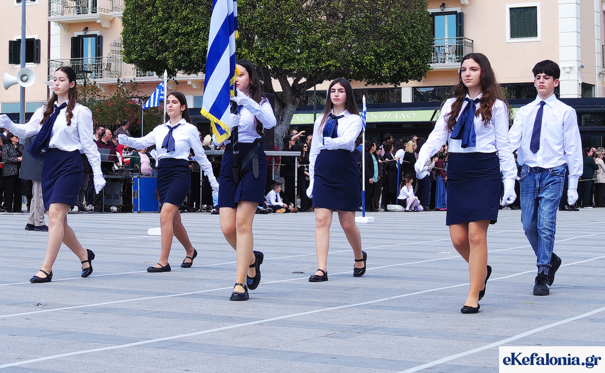 Με την ελληνική σημαία να δεσπόζει, οι μαθητές παρέλασαν με υπερηφάνεια, καταχειροκροτούμενοι από το πλήθος. Τη μουσική επένδυση της παρέλασης ανέλαβαν η Φιλαρμονική του Δήμου Αργοστολίου «Διονύσιος Λαυράγκας» και η Φιλαρμονική Σχολή Κεφαλληνίας, δημιουργώντας μια ατμόσφαιρα εθνικής ανάτασης.