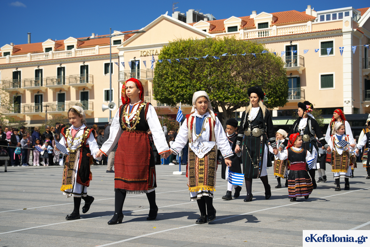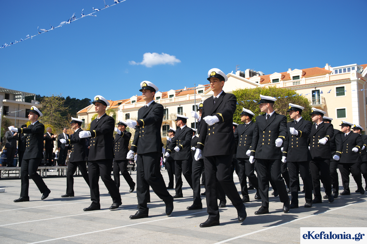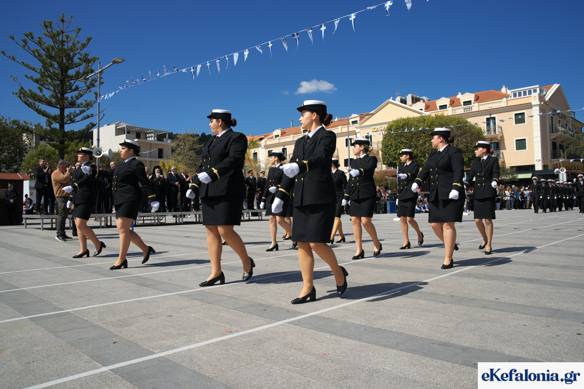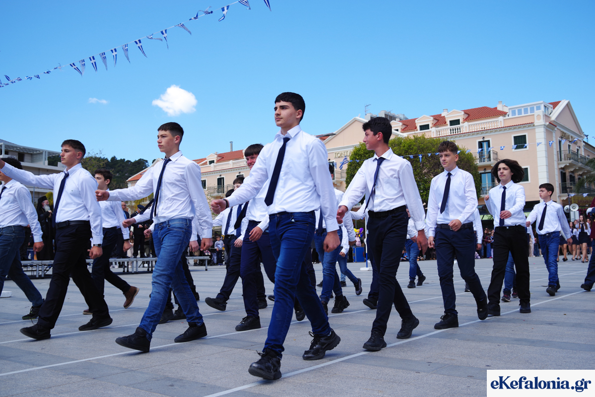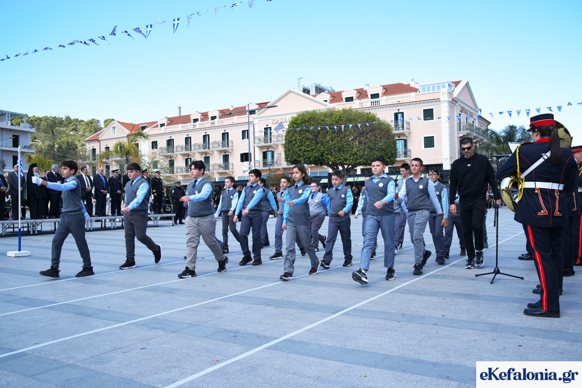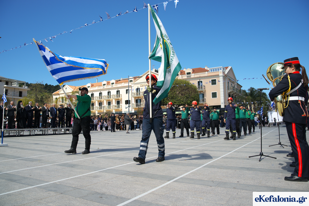 Με την ελληνική σημαία να δεσπόζει, οι μαθητές παρέλασαν με υπερηφάνεια, καταχειροκροτούμενοι από το πλήθος. Τη μουσική επένδυση της παρέλασης ανέλαβαν η Φιλαρμονική του Δήμου Αργοστολίου «Διονύσιος Λαυράγκας» και η Φιλαρμονική Σχολή Κεφαλληνίας, δημιουργώντας μια ατμόσφαιρα εθνικής ανάτασης.