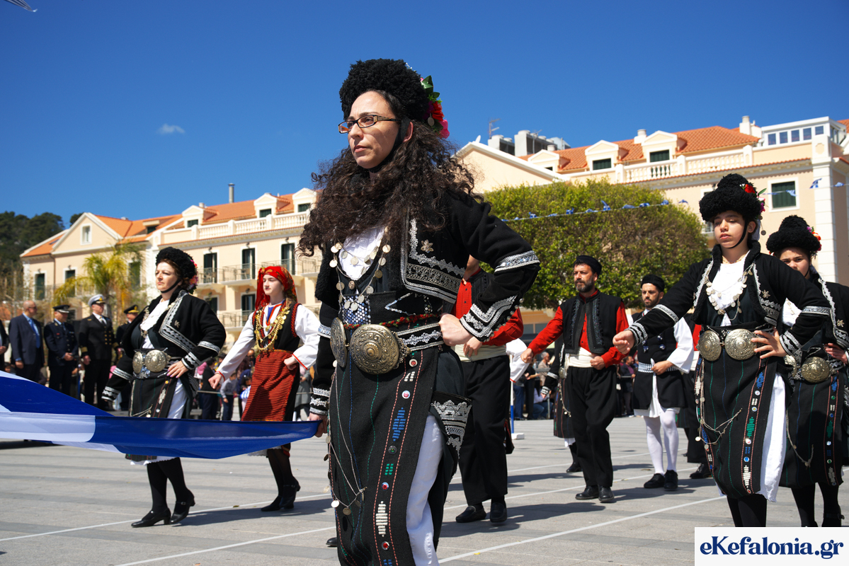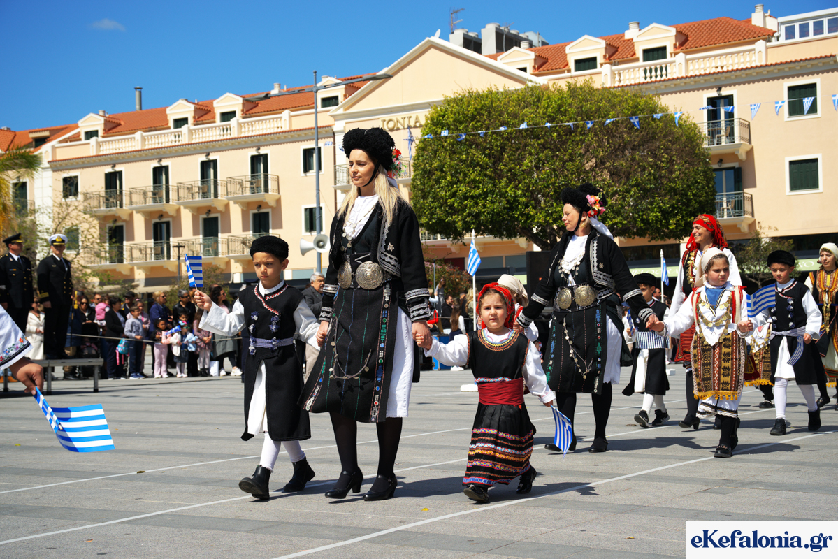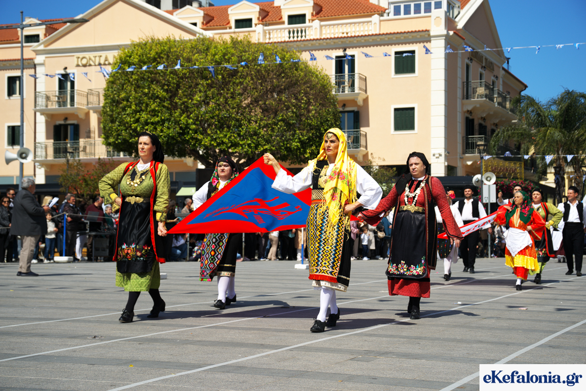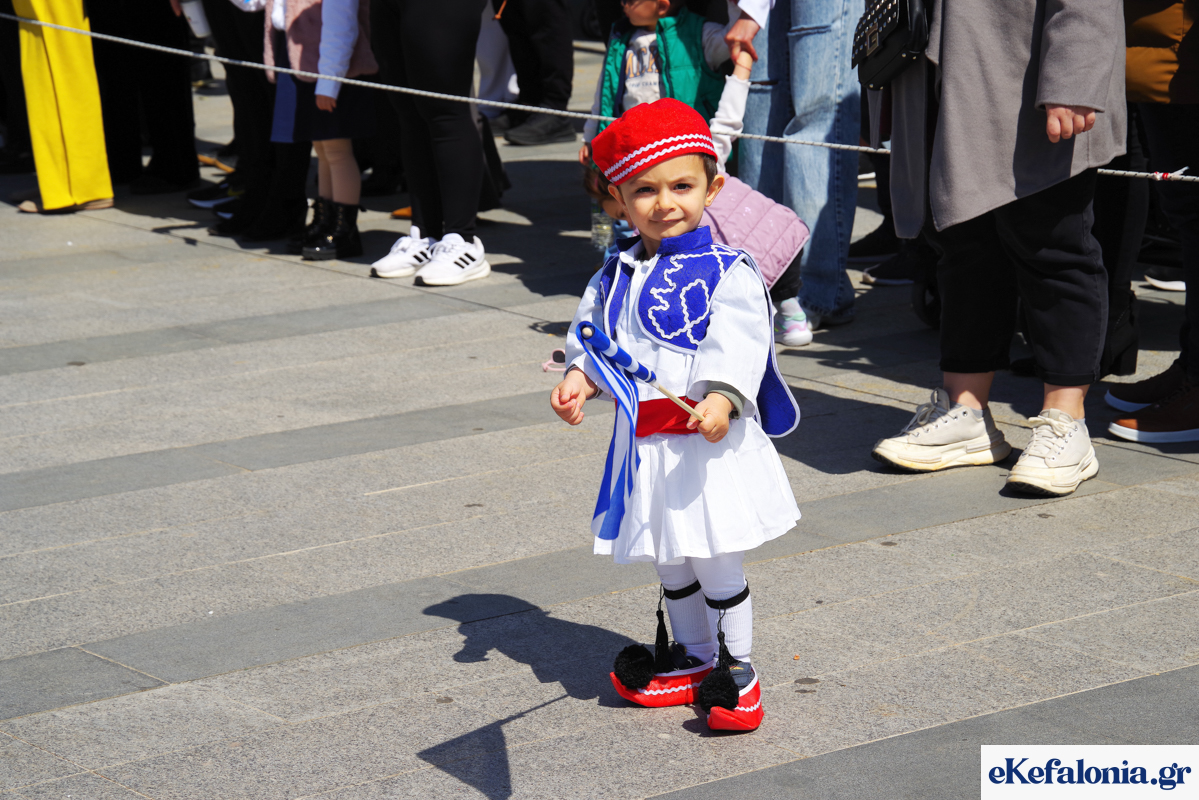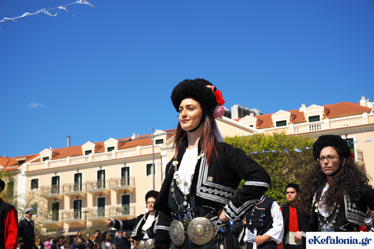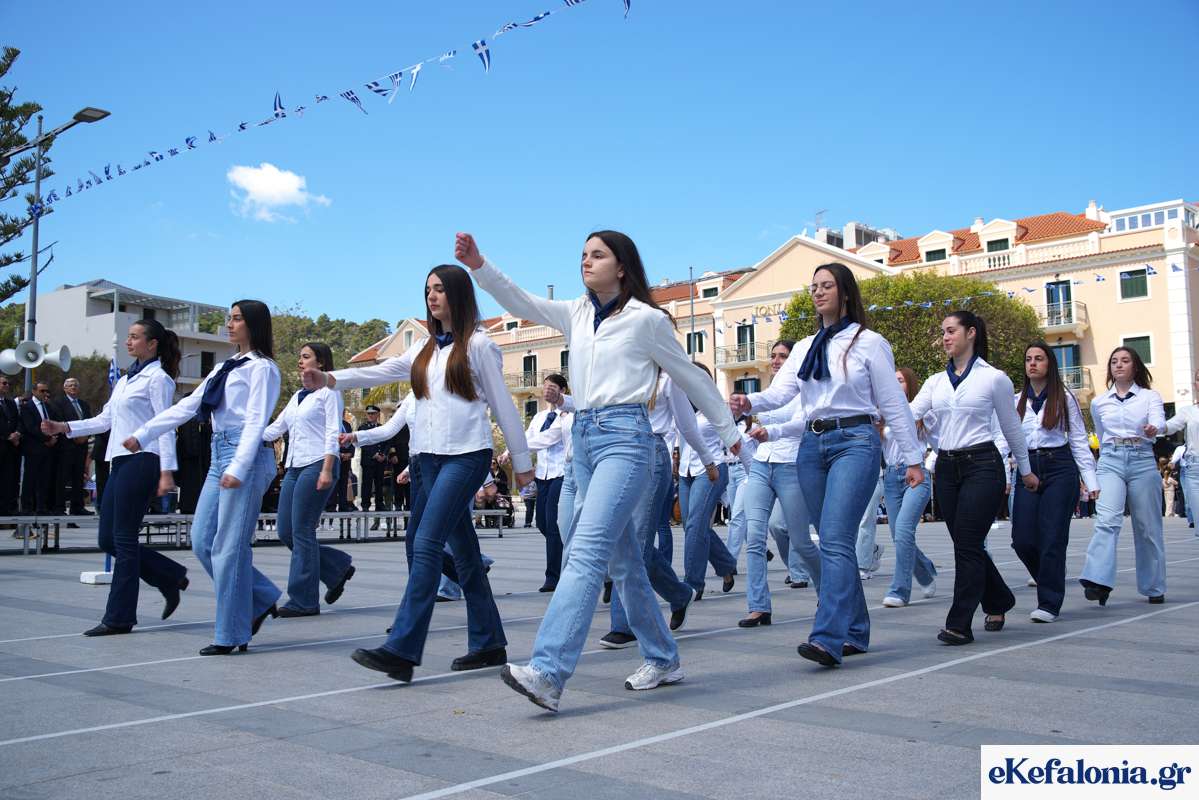 Με την ελληνική σημαία να δεσπόζει, οι μαθητές παρέλασαν με υπερηφάνεια, καταχειροκροτούμενοι από το πλήθος. Τη μουσική επένδυση της παρέλασης ανέλαβαν η Φιλαρμονική του Δήμου Αργοστολίου «Διονύσιος Λαυράγκας» και η Φιλαρμονική Σχολή Κεφαλληνίας, δημιουργώντας μια ατμόσφαιρα εθνικής ανάτασης.