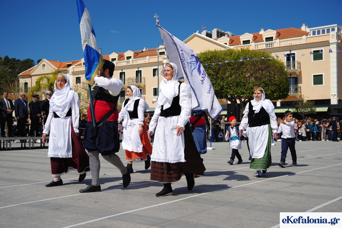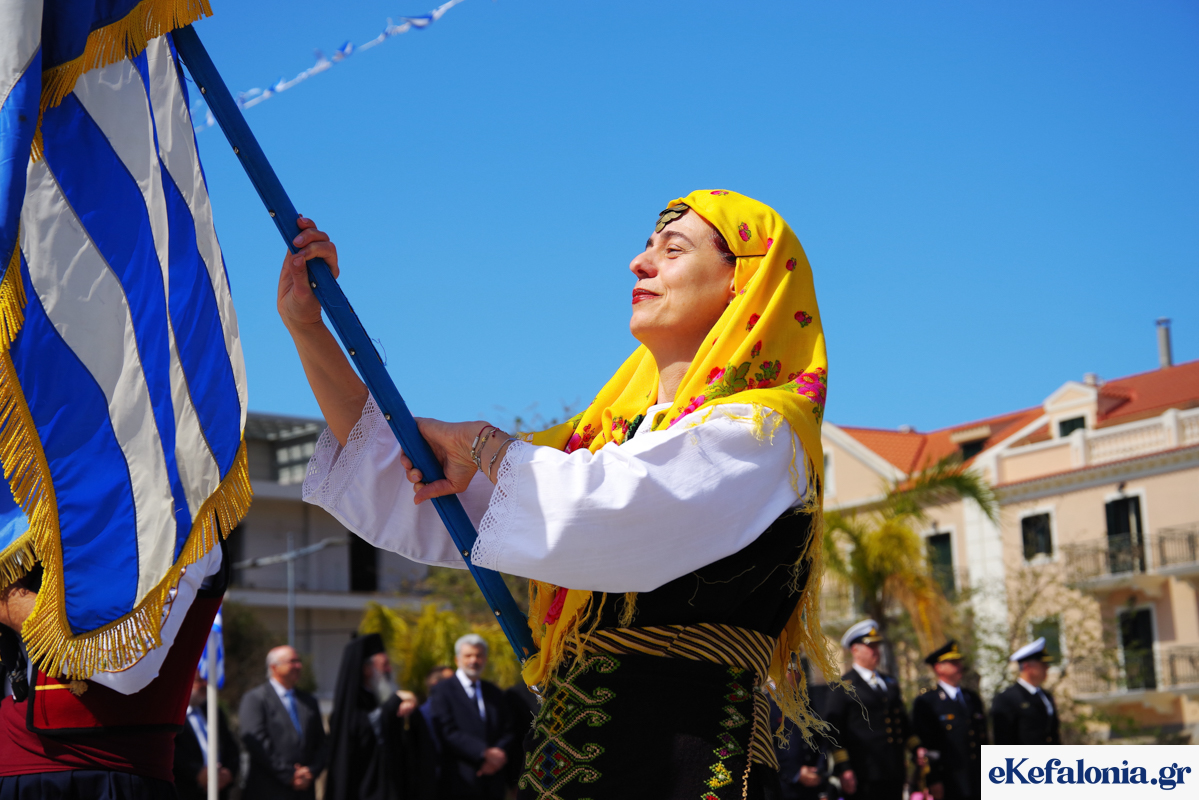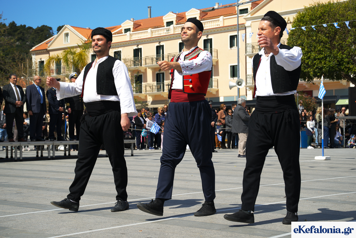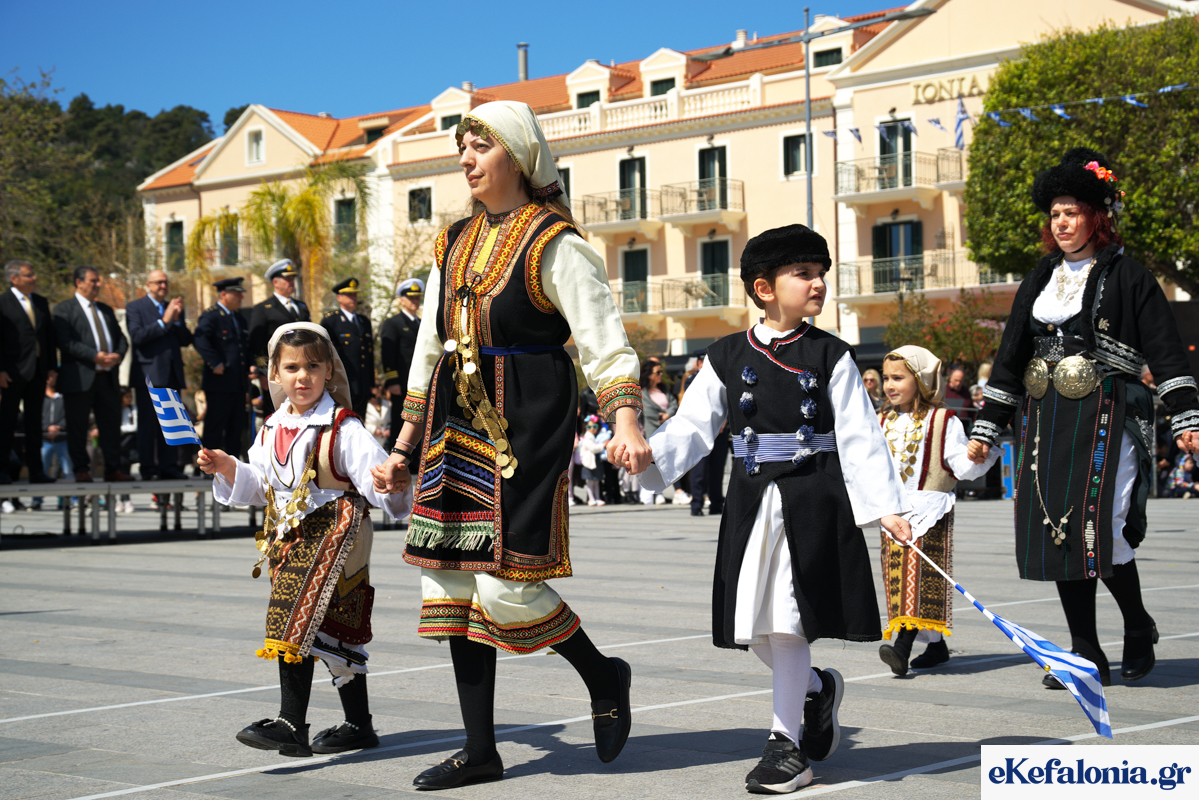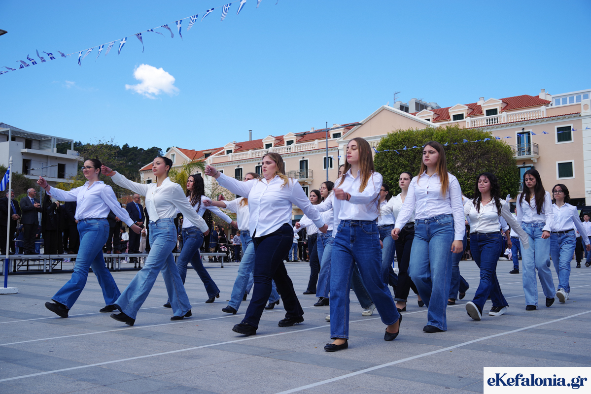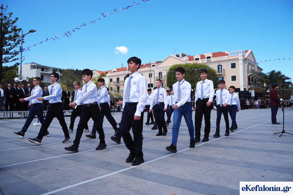 Με την ελληνική σημαία να δεσπόζει, οι μαθητές παρέλασαν με υπερηφάνεια, καταχειροκροτούμενοι από το πλήθος. Τη μουσική επένδυση της παρέλασης ανέλαβαν η Φιλαρμονική του Δήμου Αργοστολίου «Διονύσιος Λαυράγκας» και η Φιλαρμονική Σχολή Κεφαλληνίας, δημιουργώντας μια ατμόσφαιρα εθνικής ανάτασης.