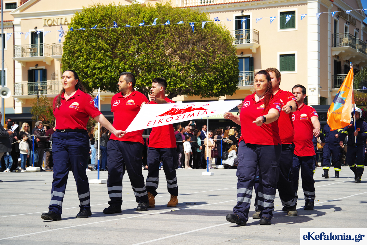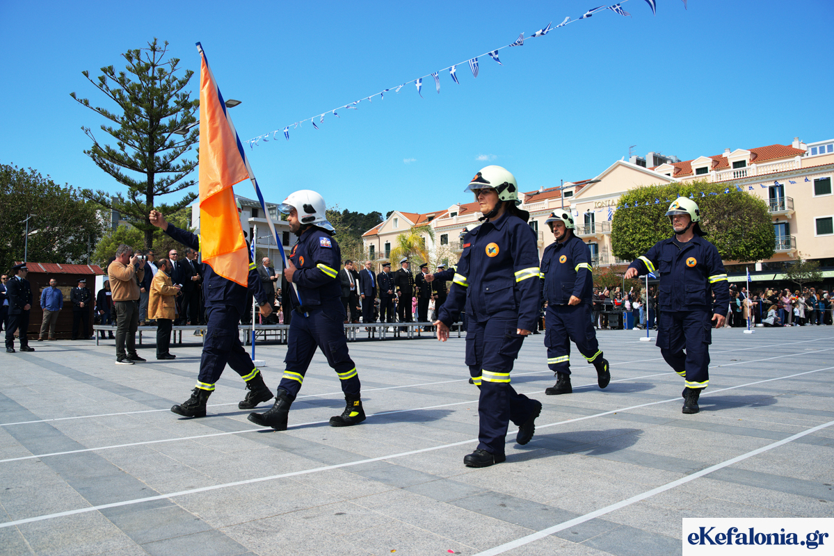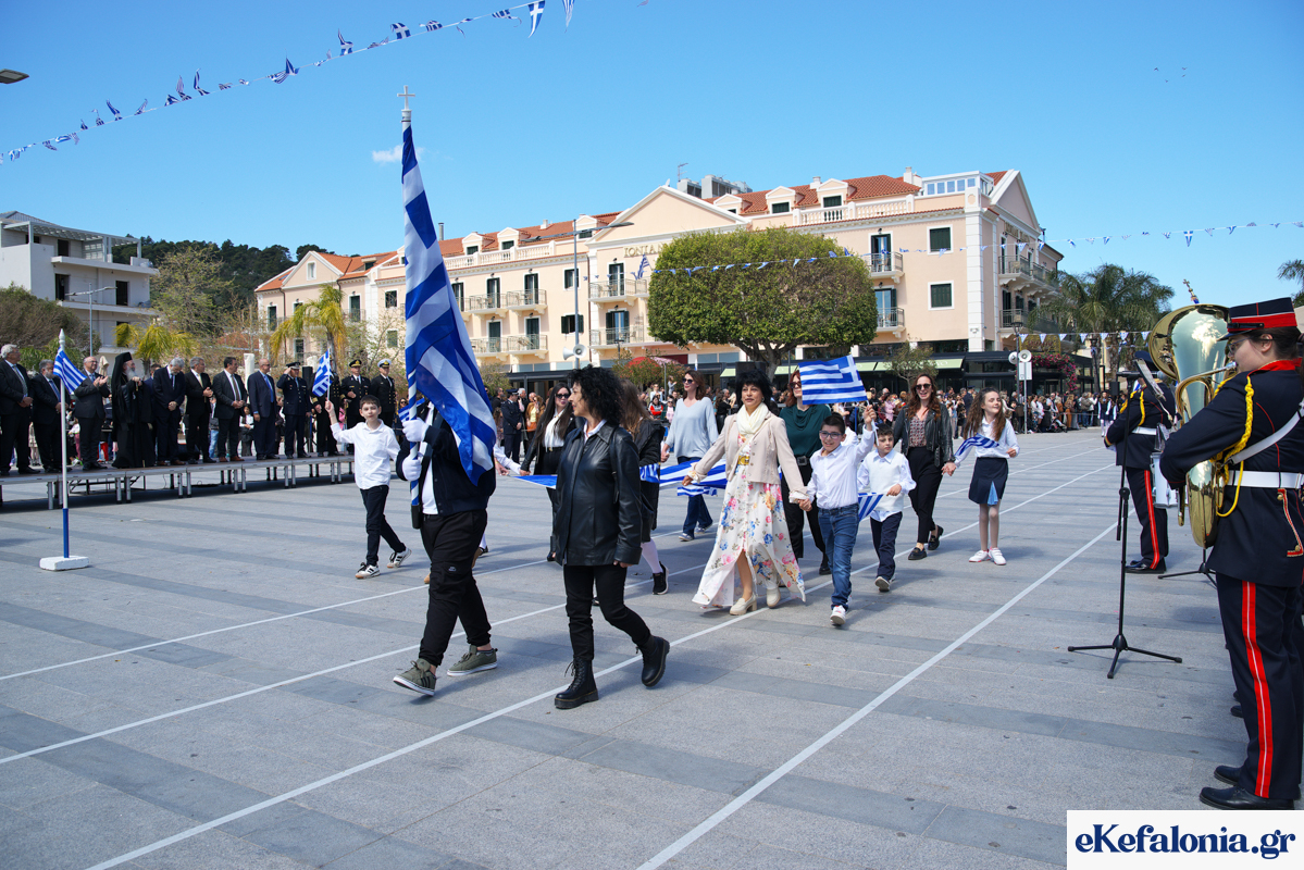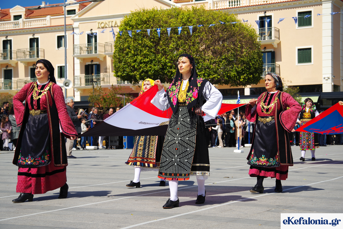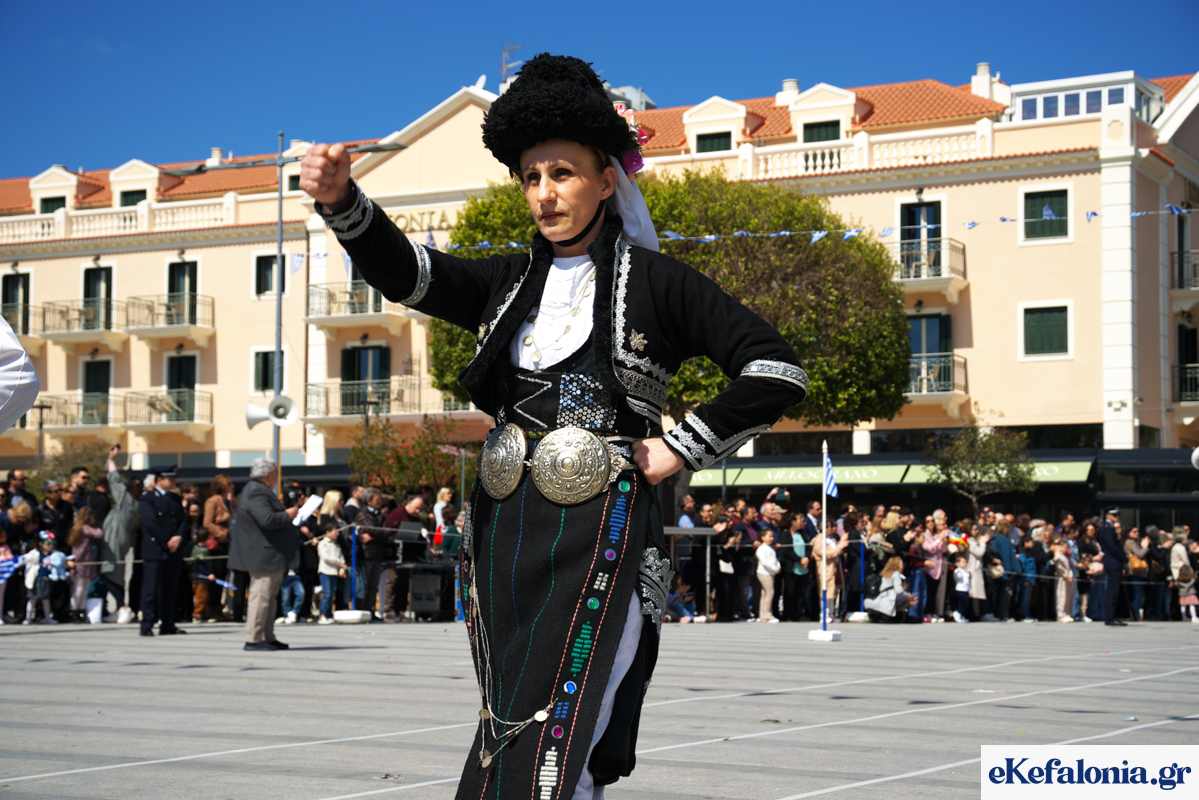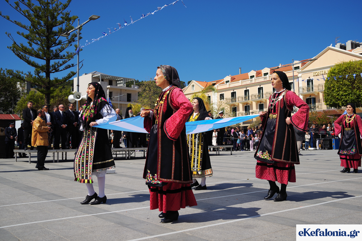 Με την ελληνική σημαία να δεσπόζει, οι μαθητές παρέλασαν με υπερηφάνεια, καταχειροκροτούμενοι από το πλήθος. Τη μουσική επένδυση της παρέλασης ανέλαβαν η Φιλαρμονική του Δήμου Αργοστολίου «Διονύσιος Λαυράγκας» και η Φιλαρμονική Σχολή Κεφαλληνίας, δημιουργώντας μια ατμόσφαιρα εθνικής ανάτασης.