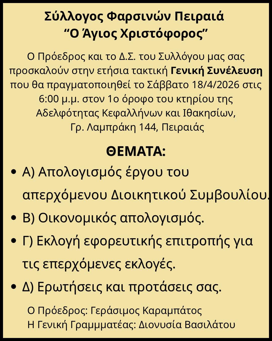 Με φόντο τις εκλογές η Γενική Συνέλευση των Φαρσινών Πειραιά
