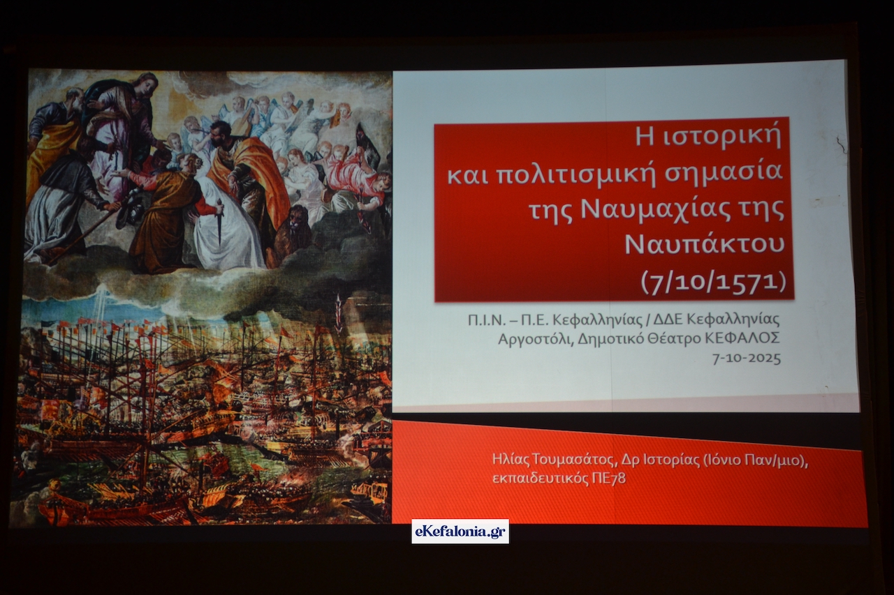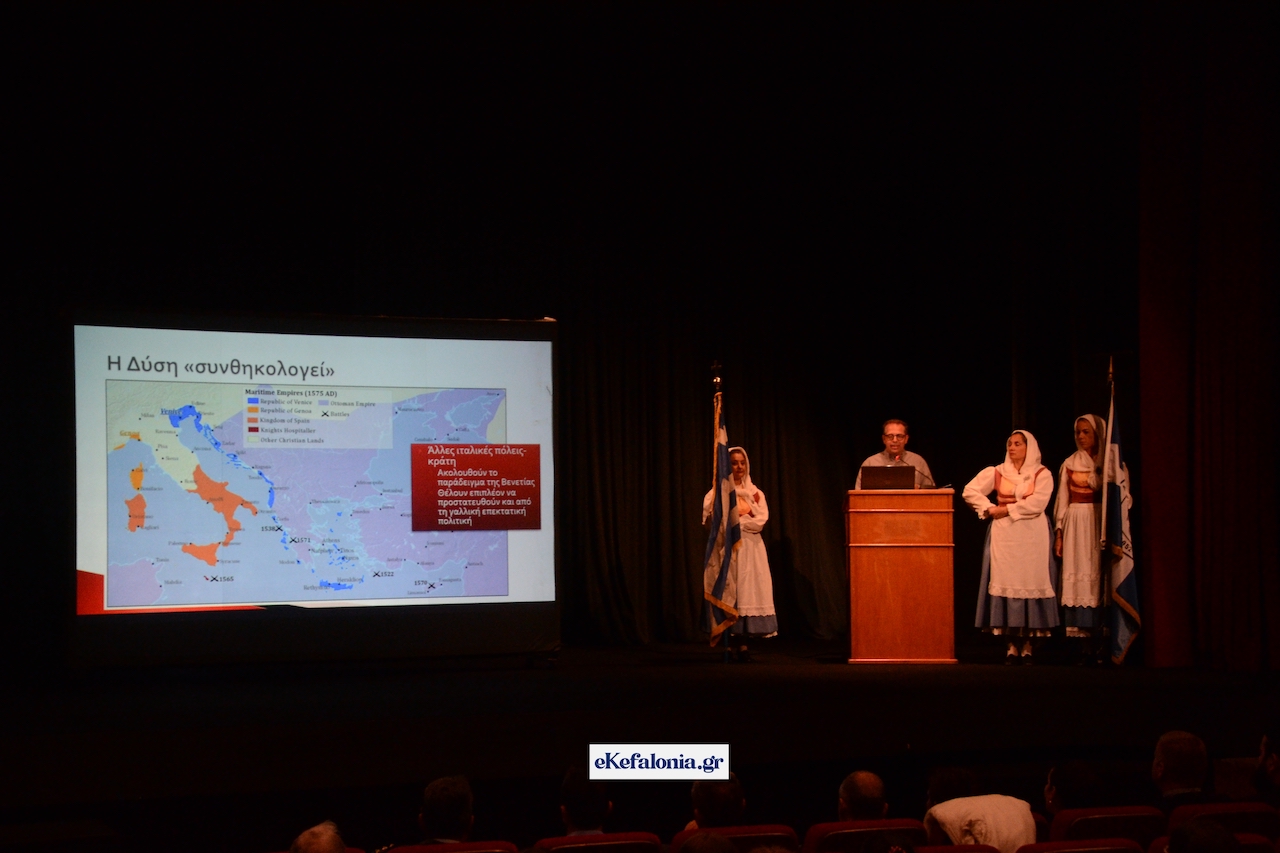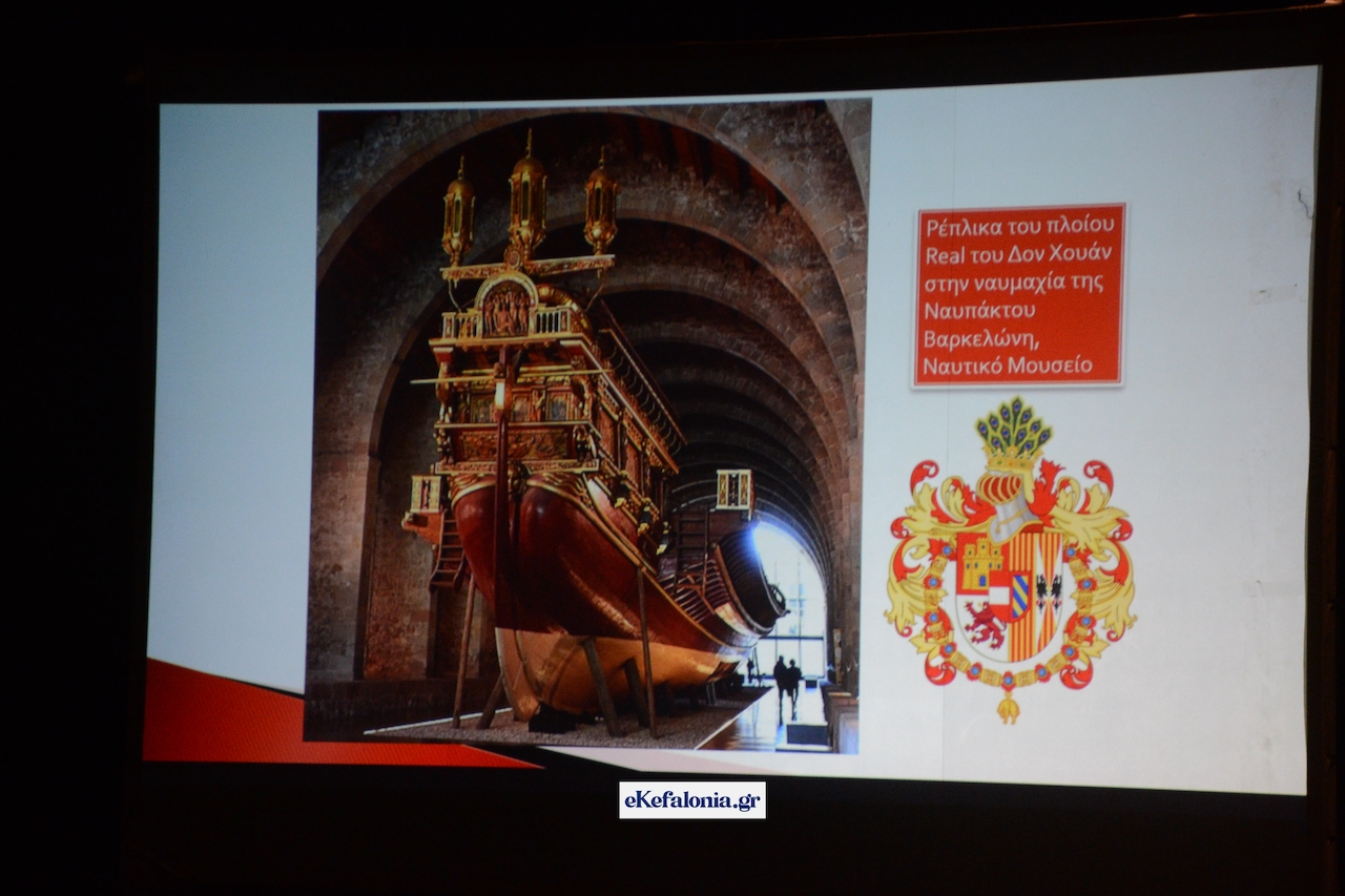 Ακολούθως, οι παριστάμενοι μετέβησαν στο Δημοτικό Θέατρο «Κέφαλος», όπου ο συγγραφέας – καθηγητής Ηλίας Τουμασάτος παρουσίασε μια τεκμηριωμένη ιστορική αναδρομή με θέμα «Η ιστορική και πολιτισμική σημασία της Ναυμαχίας της Ναυπάκτου».