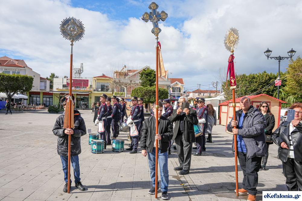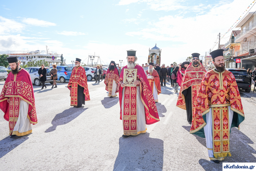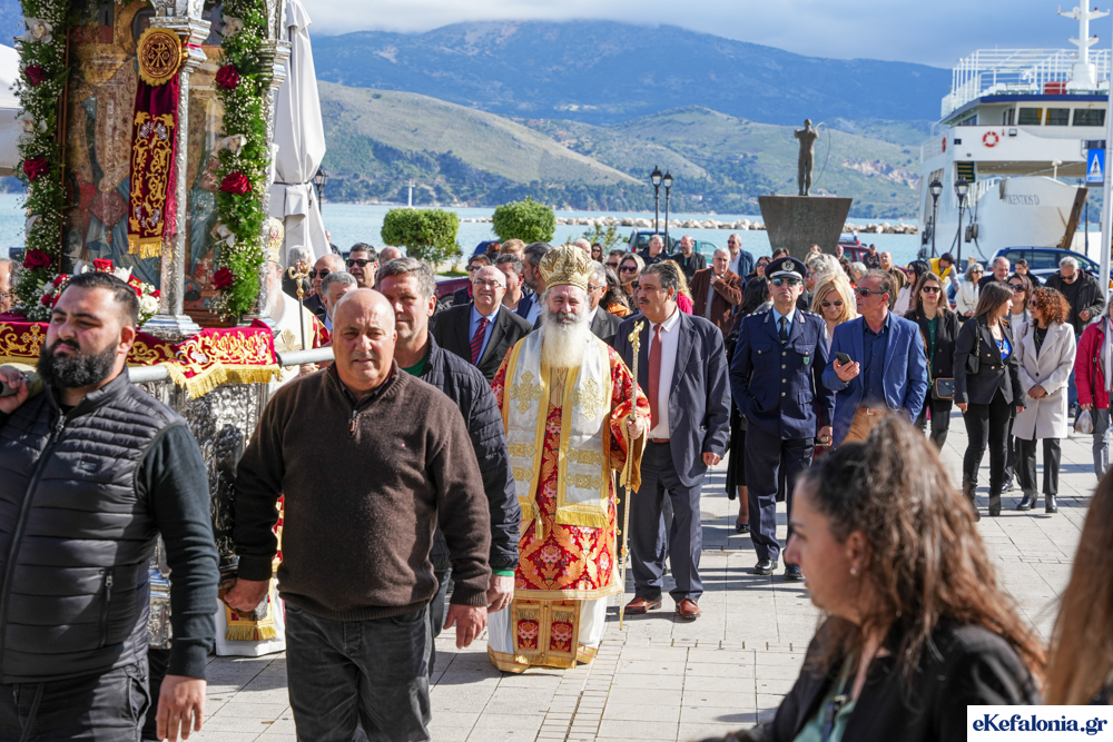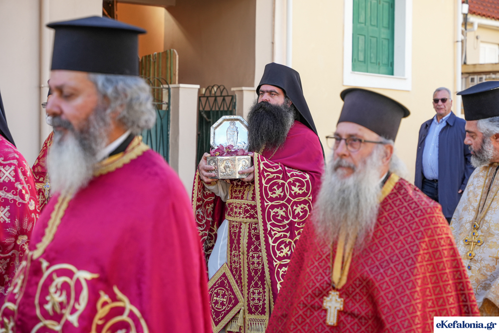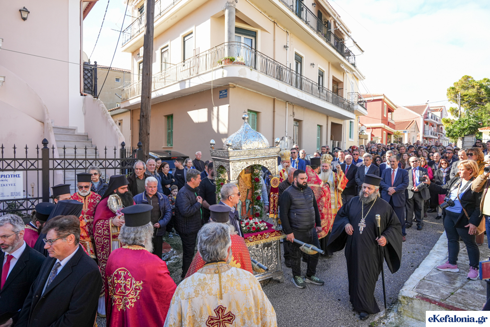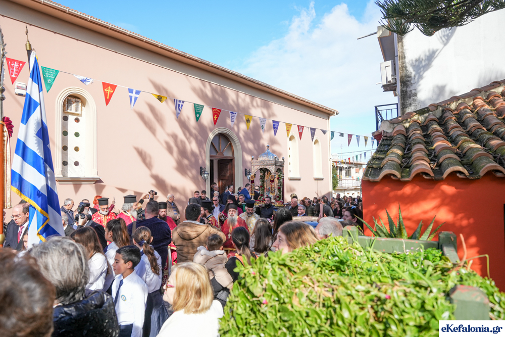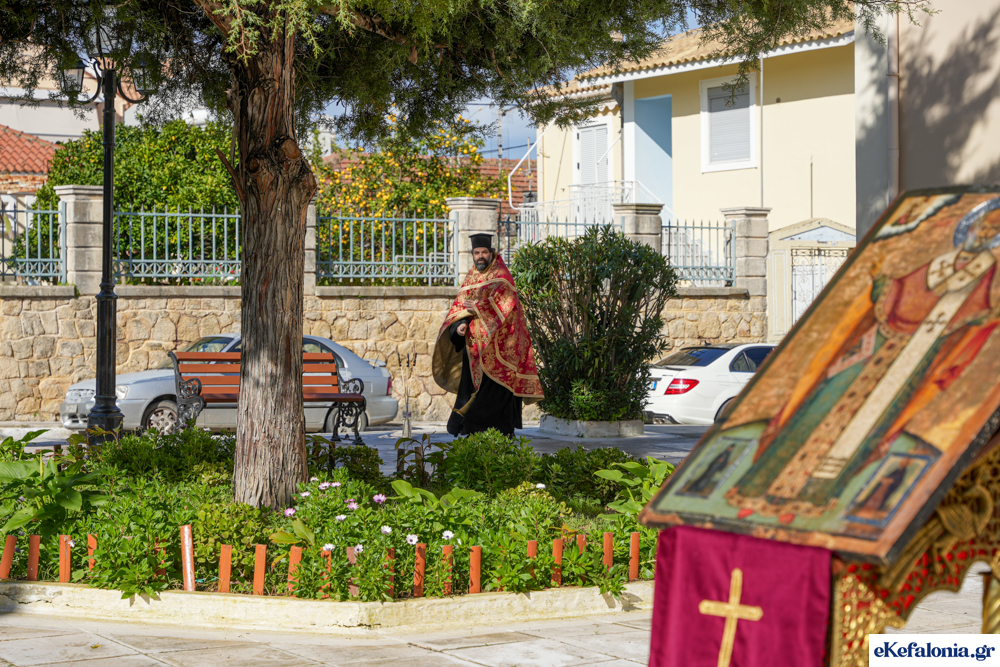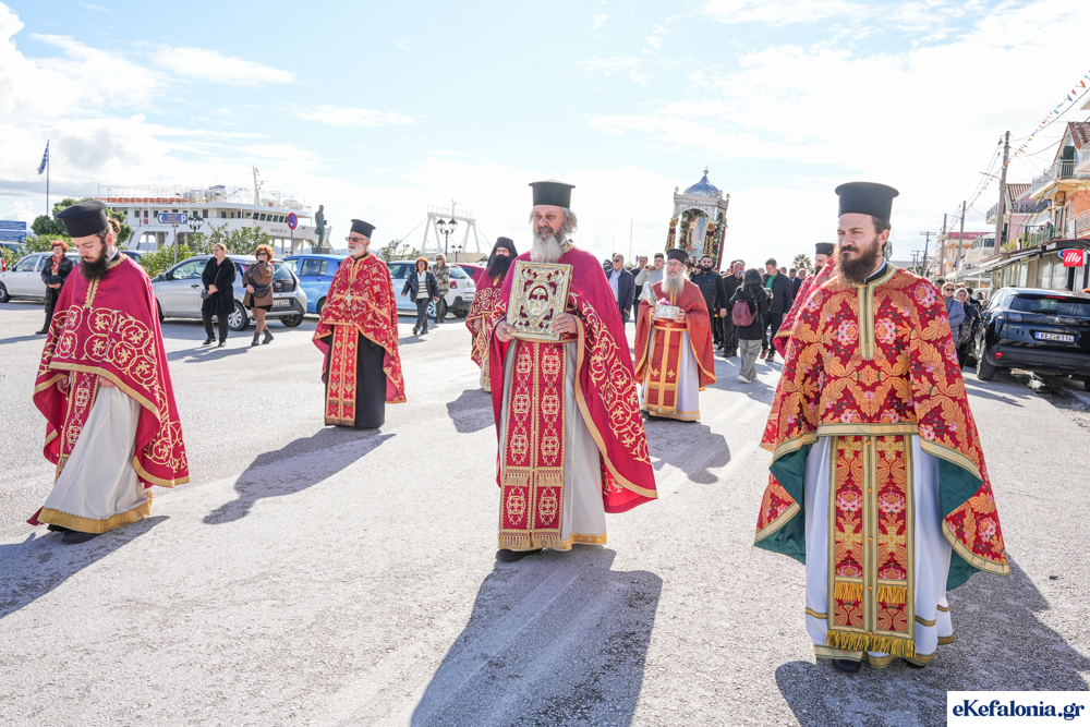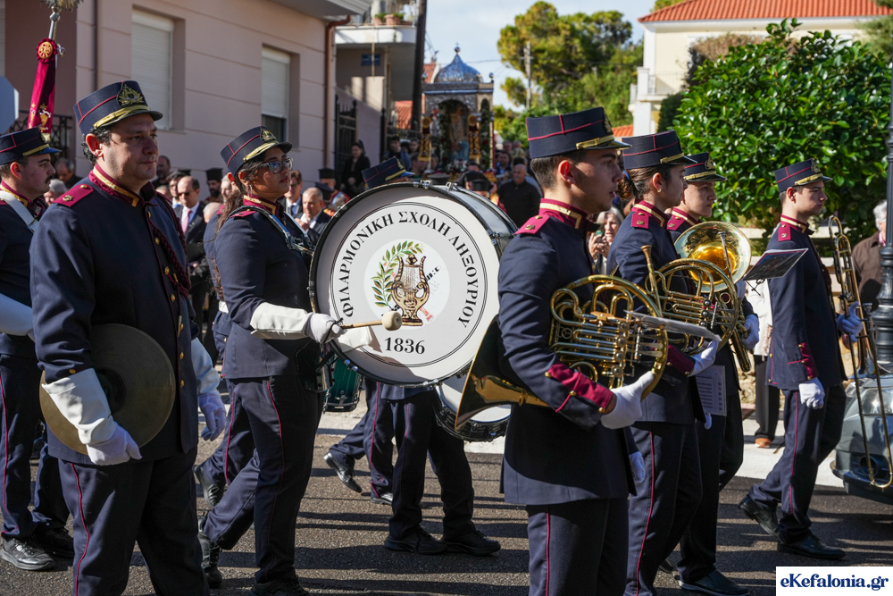 Στις 11 περίπου ξεκίνησε η λιτάνευση της ιερής εικόνας και του ιερού Λειψάνου του Αγίου στους δρόμους του Ληξουρίου μέχρι την κεντρική πλατεία, με ενδιάμεση στάση το κελί του Αγίου Παναγή Μπασιά. Την πομπή ακολούθησαν, καθόλη την πορεία της, η Φιλαρμονική Σχολή Ληξουρίου, μαθητές σχολείων με όμορφες φορεσιές και εκατοντάδες πιστοί.