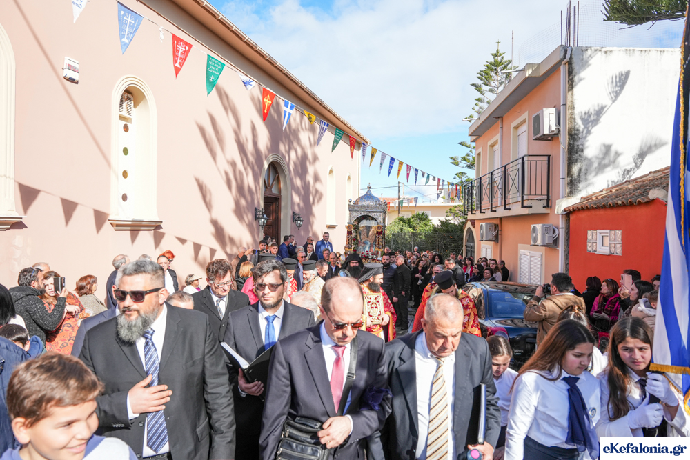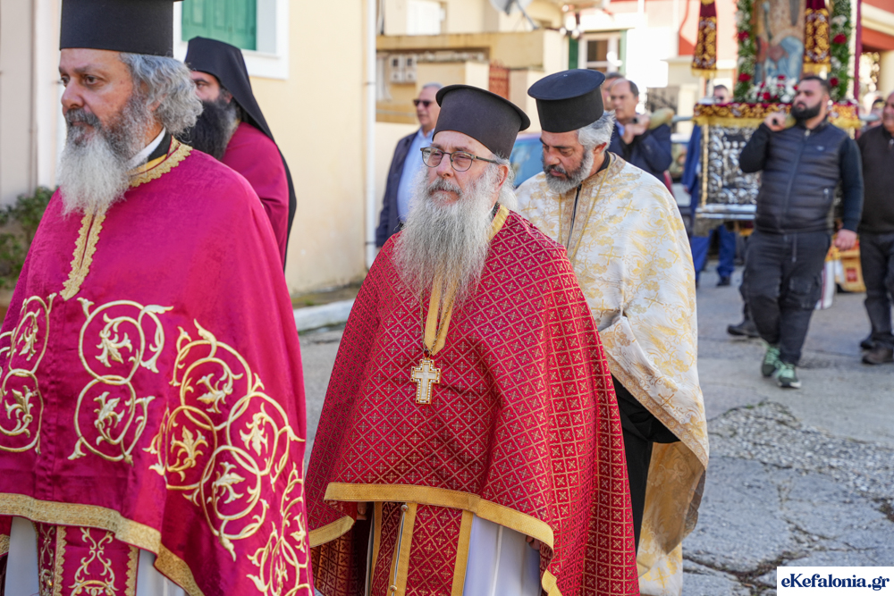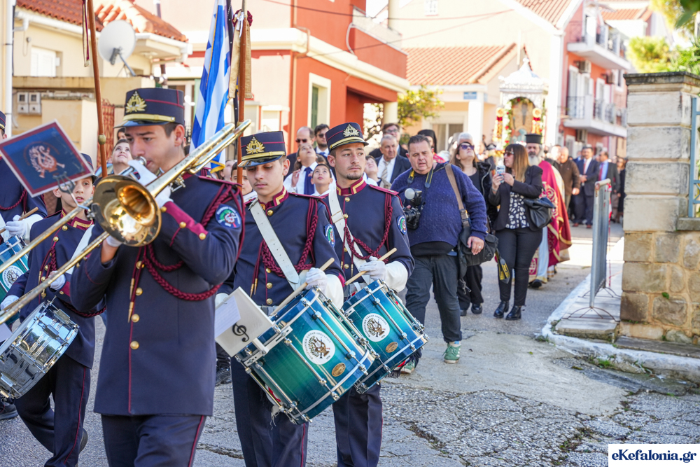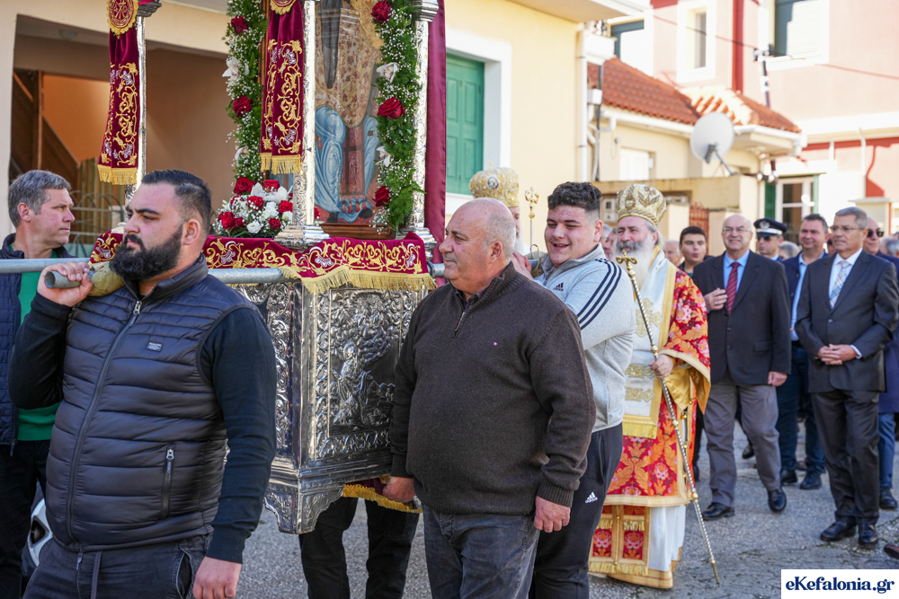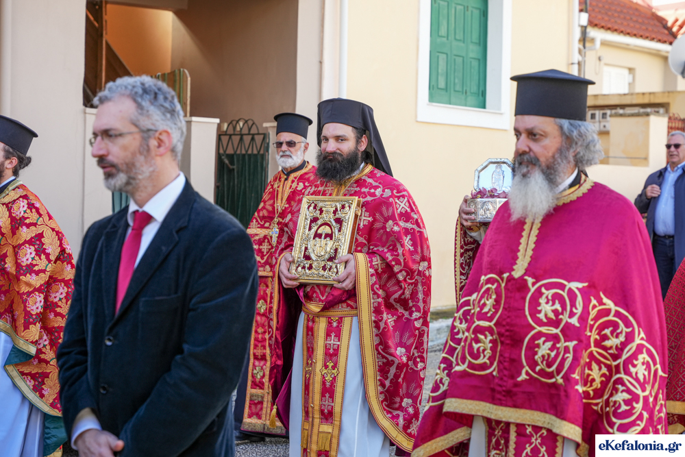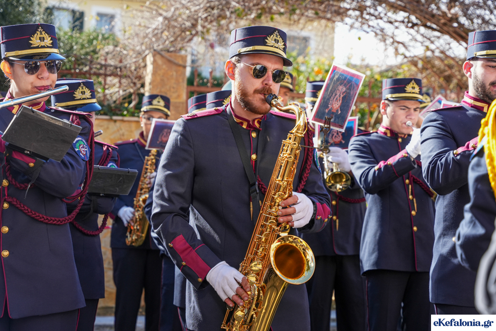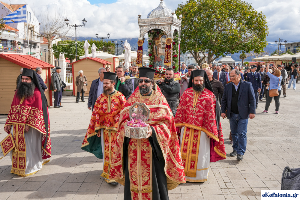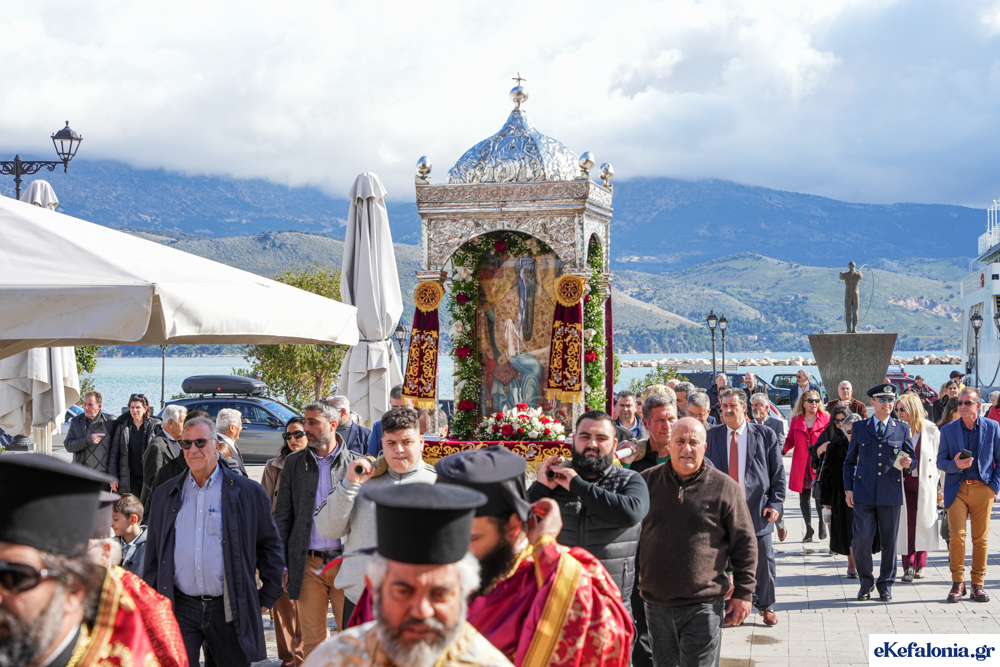 Στις 11 περίπου ξεκίνησε η λιτάνευση της ιερής εικόνας και του ιερού Λειψάνου του Αγίου στους δρόμους του Ληξουρίου μέχρι την κεντρική πλατεία, με ενδιάμεση στάση το κελί του Αγίου Παναγή Μπασιά. Την πομπή ακολούθησαν, καθόλη την πορεία της, η Φιλαρμονική Σχολή Ληξουρίου, μαθητές σχολείων με όμορφες φορεσιές και εκατοντάδες πιστοί.