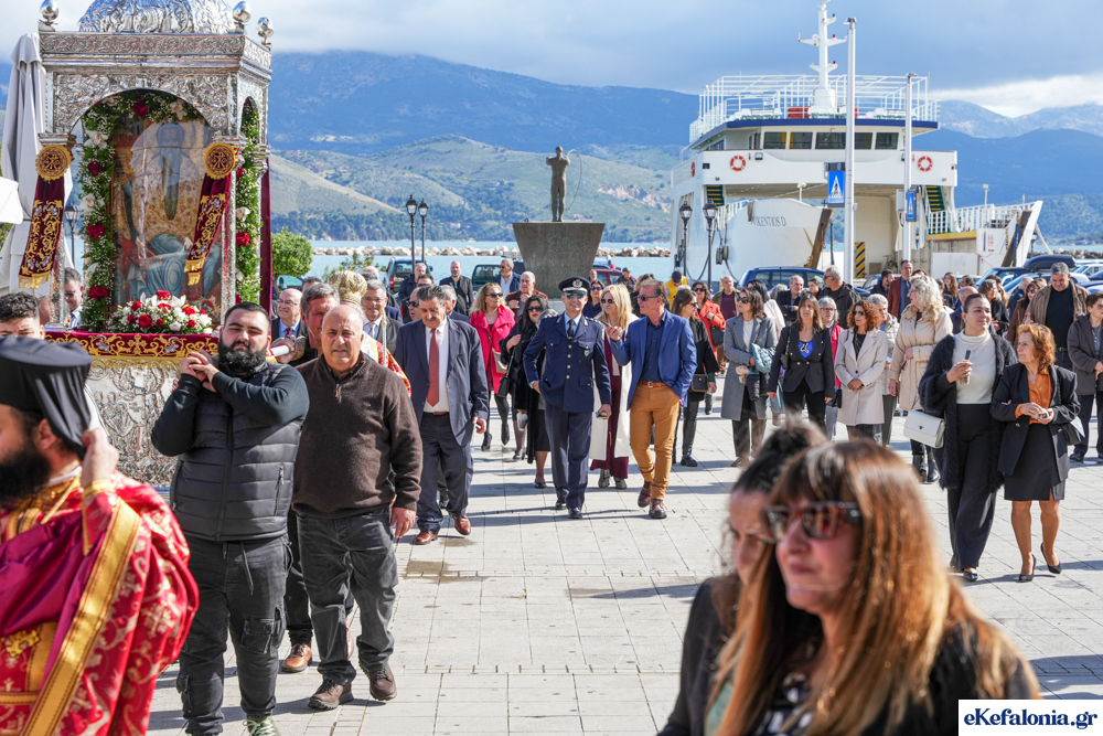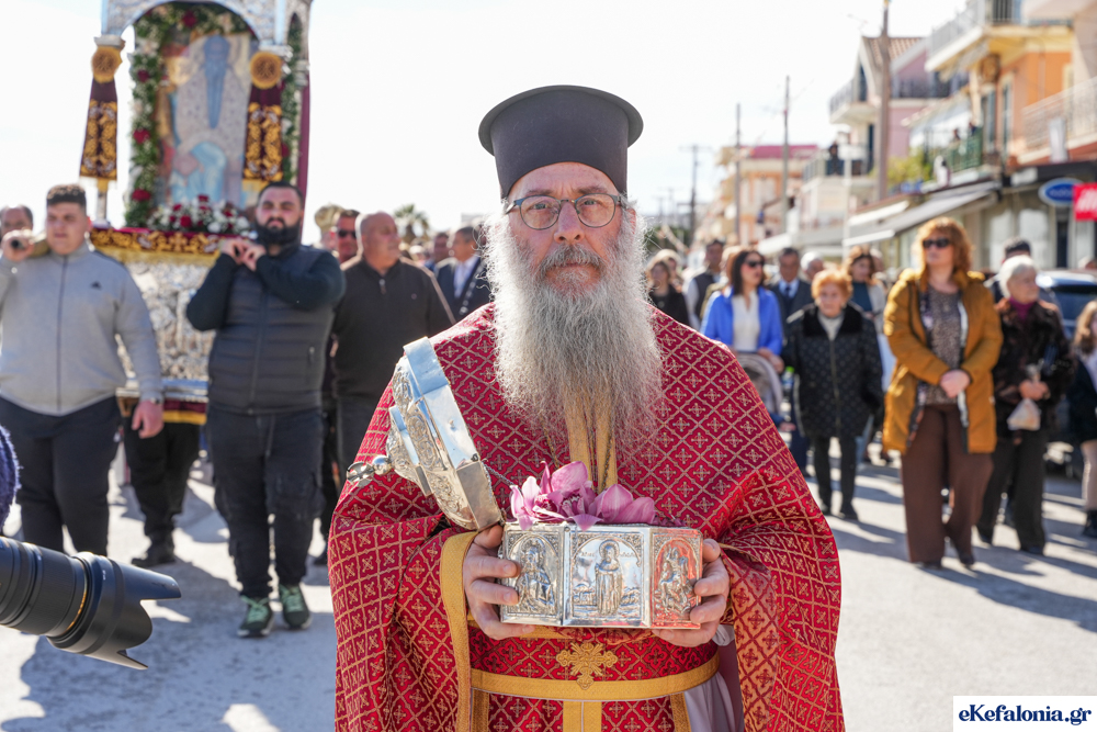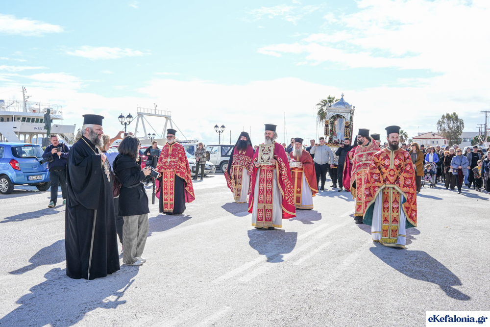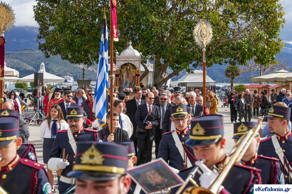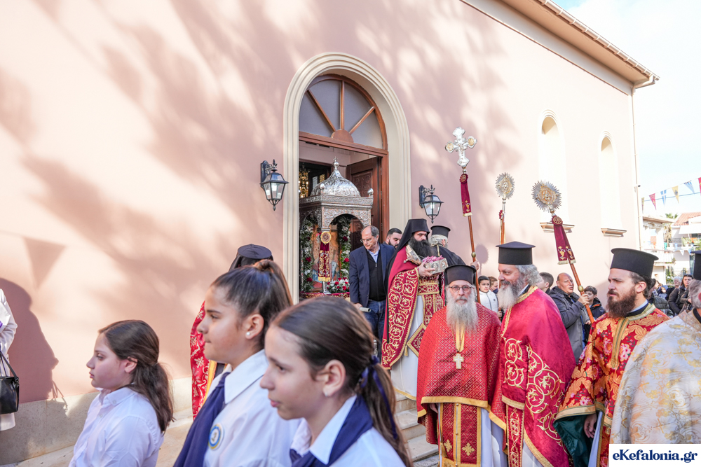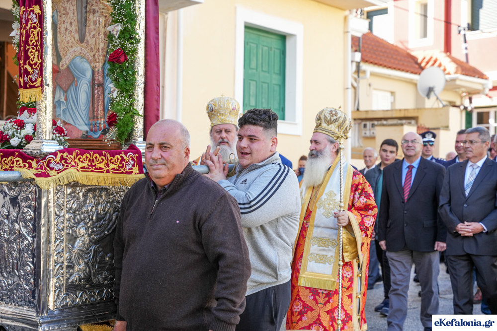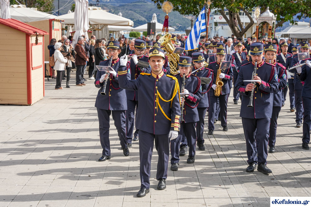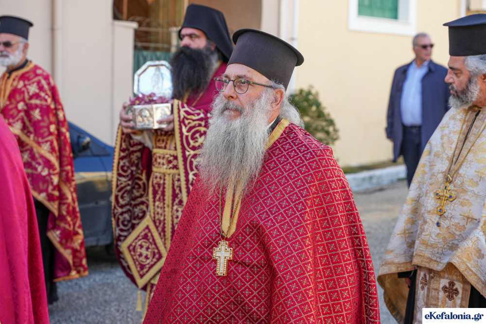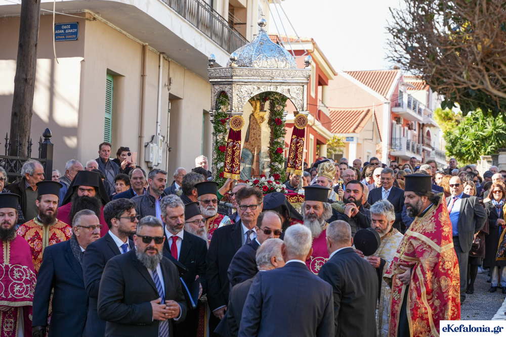 Στις 11 περίπου ξεκίνησε η λιτάνευση της ιερής εικόνας και του ιερού Λειψάνου του Αγίου στους δρόμους του Ληξουρίου μέχρι την κεντρική πλατεία, με ενδιάμεση στάση το κελί του Αγίου Παναγή Μπασιά. Την πομπή ακολούθησαν, καθόλη την πορεία της, η Φιλαρμονική Σχολή Ληξουρίου, μαθητές σχολείων με όμορφες φορεσιές και εκατοντάδες πιστοί.