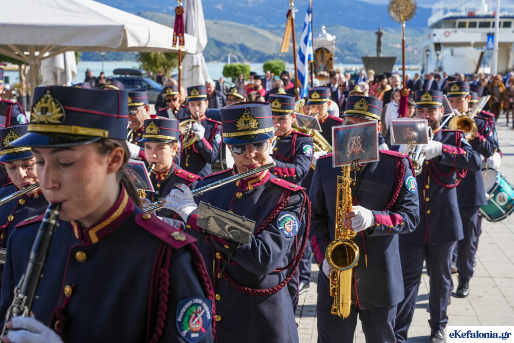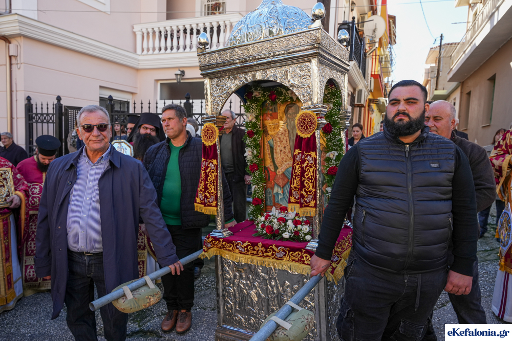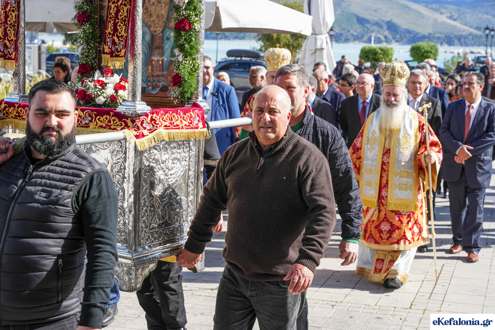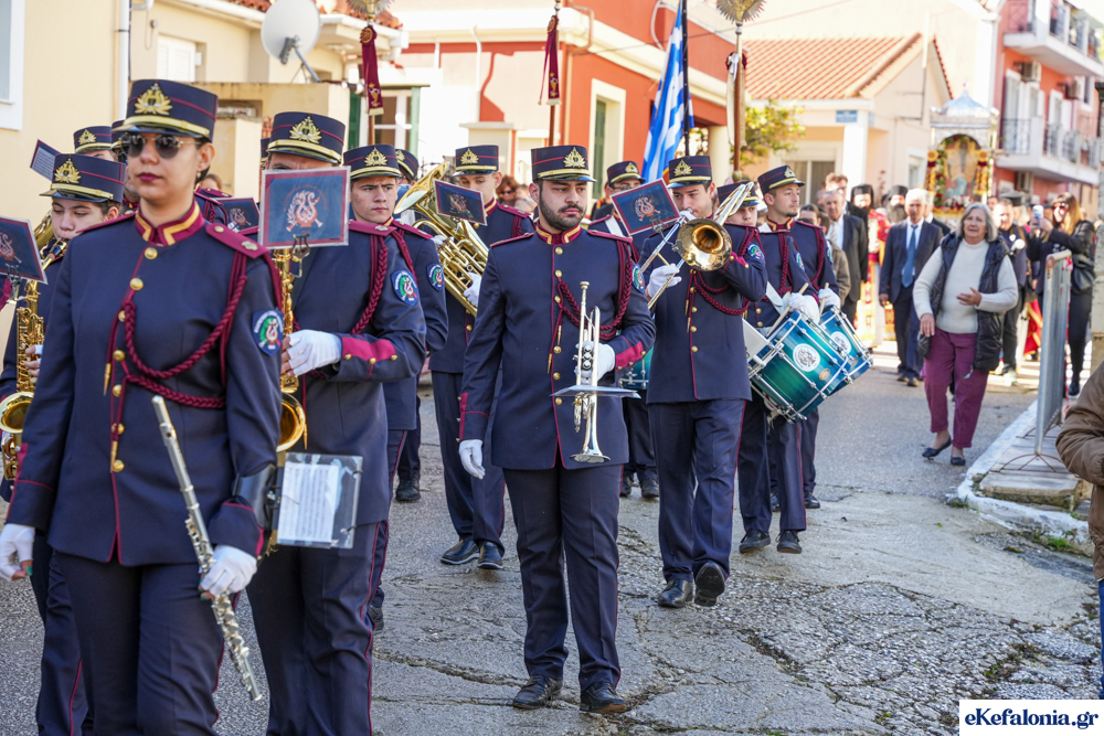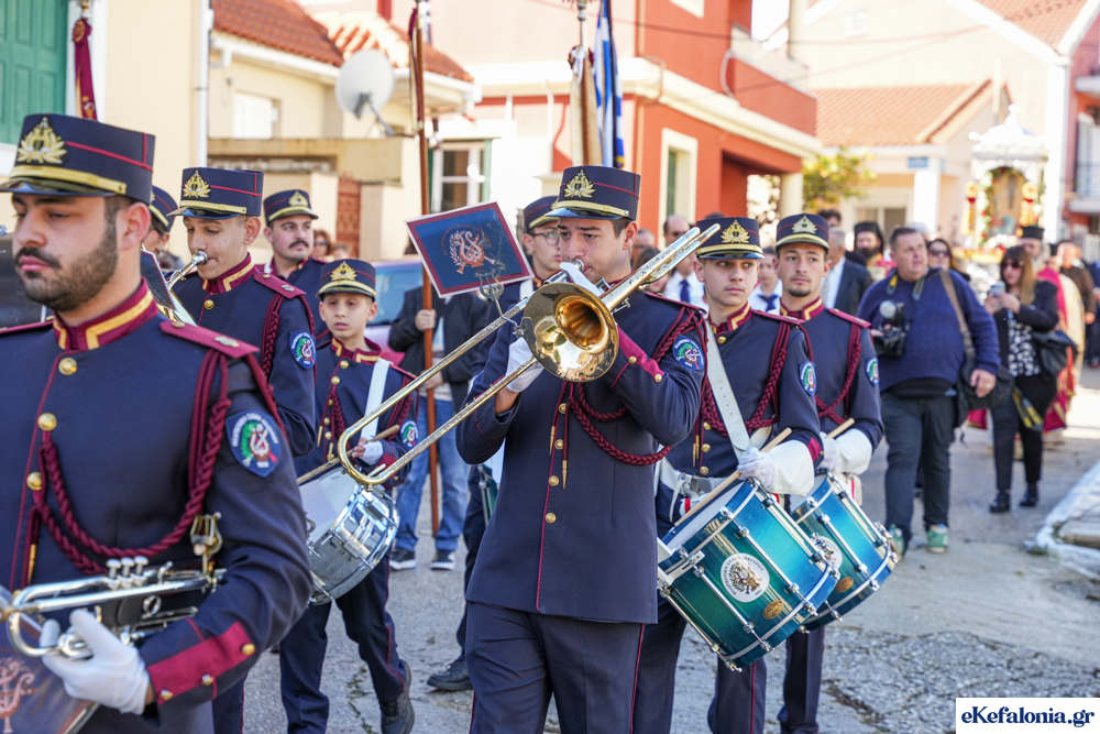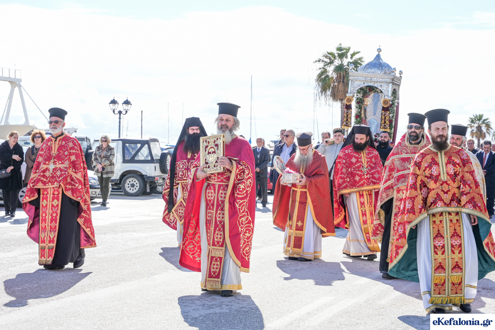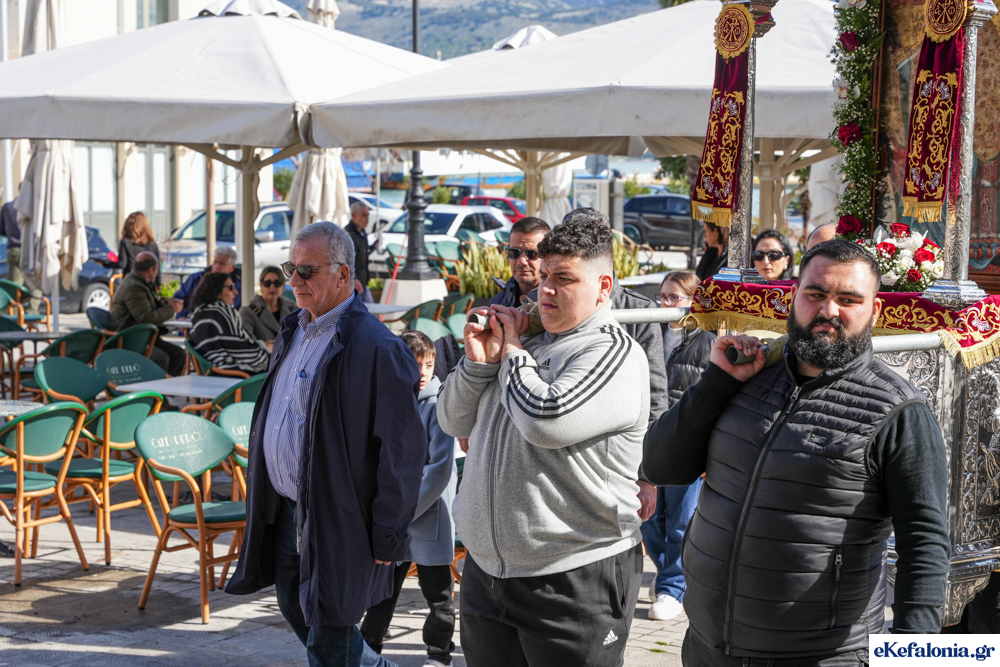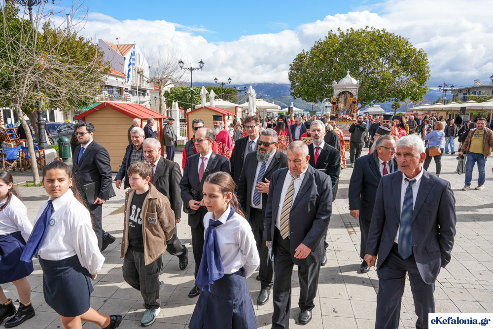 Στις 11 περίπου ξεκίνησε η λιτάνευση της ιερής εικόνας και του ιερού Λειψάνου του Αγίου στους δρόμους του Ληξουρίου μέχρι την κεντρική πλατεία, με ενδιάμεση στάση το κελί του Αγίου Παναγή Μπασιά. Την πομπή ακολούθησαν, καθόλη την πορεία της, η Φιλαρμονική Σχολή Ληξουρίου, μαθητές σχολείων με όμορφες φορεσιές και εκατοντάδες πιστοί.