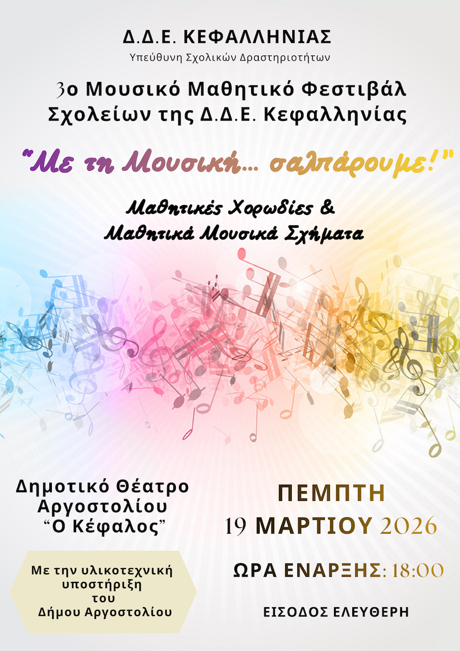 Η Διεύθυνση Δευτεροβάθμιας Εκπαίδευσης Κεφαλληνίας δια της Υπεύθυνης Σχολικών Δραστηριοτήτων διοργανώνει το 3ο Μουσικό Μαθητικό Φεστιβάλ των σχολείων της Δ.Δ.Ε. Κεφαλληνίας με τίτλο: «Με τη Μουσική… σαλπάρουμε!», την Πέμπτη 19 Μαρτίου 2026 και ώρα έναρξης: 18:00, στο Δημοτικό Θέατρο Αργοστολίου «Ο Κέφαλος», με την υλικοτεχνική υποστήριξη του Δήμου Αργοστολίου.
