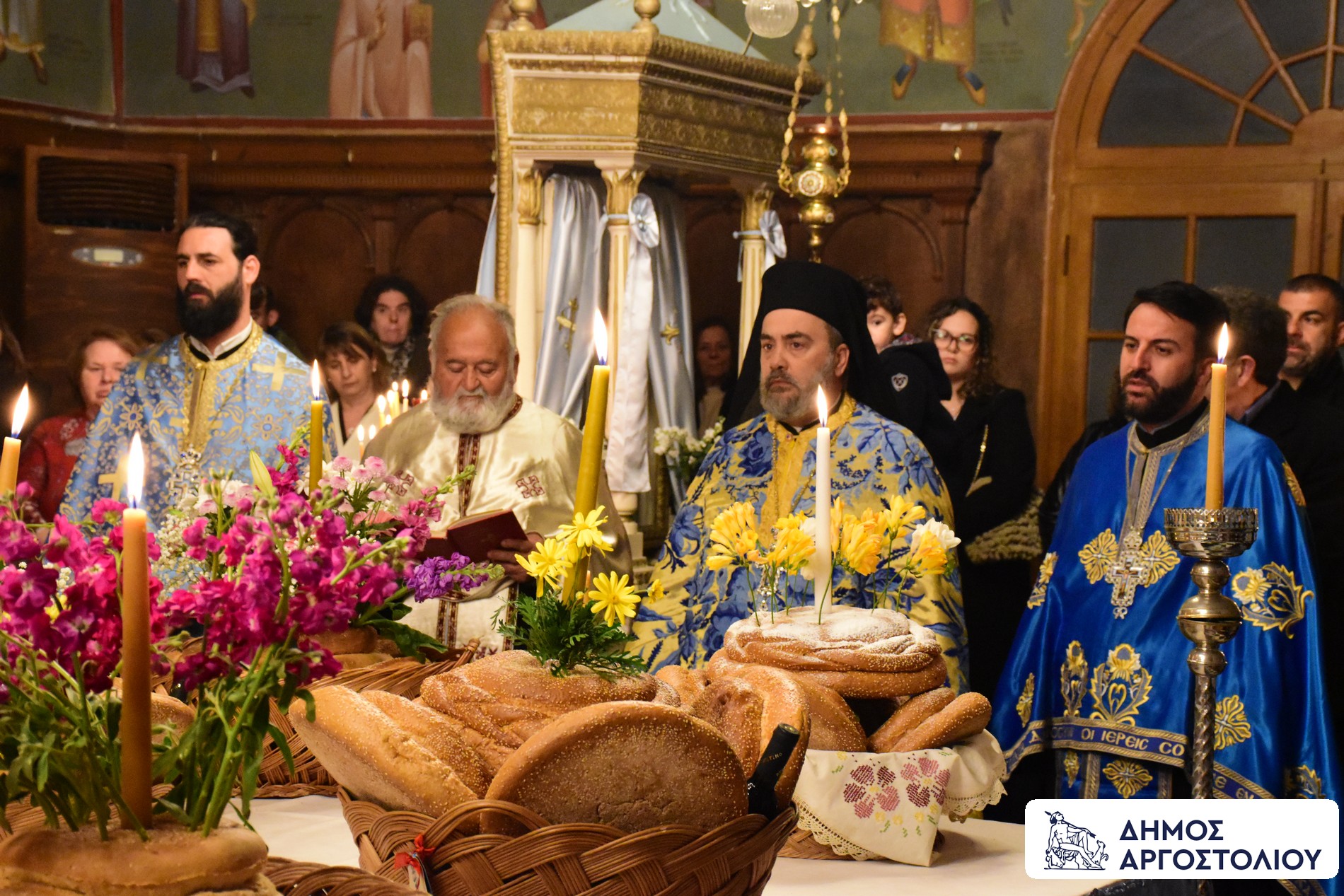 Της ακολουθίας προεξήρχε ο Αρχιμανδρίτης π. Φώτιος Γραβιελάτος, πλαισιωμένος από τον εφημέριο του ναού, π. Βασίλειο, καθώς και αρκετούς ακόμη ιερείς από ενορίες του νησιού. Οι πολυάριθμες αρτοκλασίες ανέδειξαν τη βαθιά αγάπη των πιστών για την ενορία τους και την Παναγία.