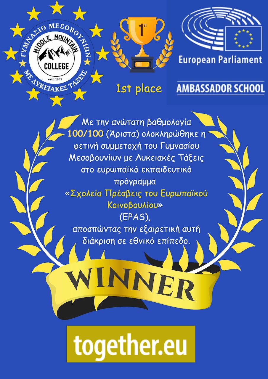 Με την ανώτατη βαθμολογία 100/100 (Άριστα) ολοκληρώθηκε η φετινή συμμετοχή του Γυμνασίου Μεσοβουνίων με Λυκειακές Τάξεις στο ευρωπαϊκό εκπαιδευτικό πρόγραμμα «Σχολεία Πρέσβεις του Ευρωπαϊκού Κοινοβουλίου» (EPAS), αποσπώντας την εξαιρετική αυτή διάκριση σε εθνικό επίπεδο.