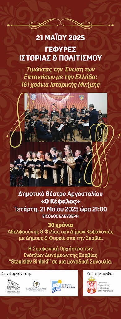Ο Δήμος Αργοστολίου σε συνεργασία με τον Δήμο Ληξουρίου, την Περιφερειακή Ενότητα Κεφαλληνίας της ΠΙΝ και υπό την αιγίδα του Προξενείου της Δημοκρατίας της Σερβίας στην Κεφαλονιά, διοργανώνουν ένα ξεχωριστό πολιτιστικό γεγονός με αφορμή την 161η Επέτειο της Ένωσης των Επτανήσων με την Ελλάδα και τη συμπλήρωση 30 χρόνων ισχυρών δεσμών μεταξύ των Δήμων της Κεφαλονιάς με Δήμους και φορείς της Σερβίας.